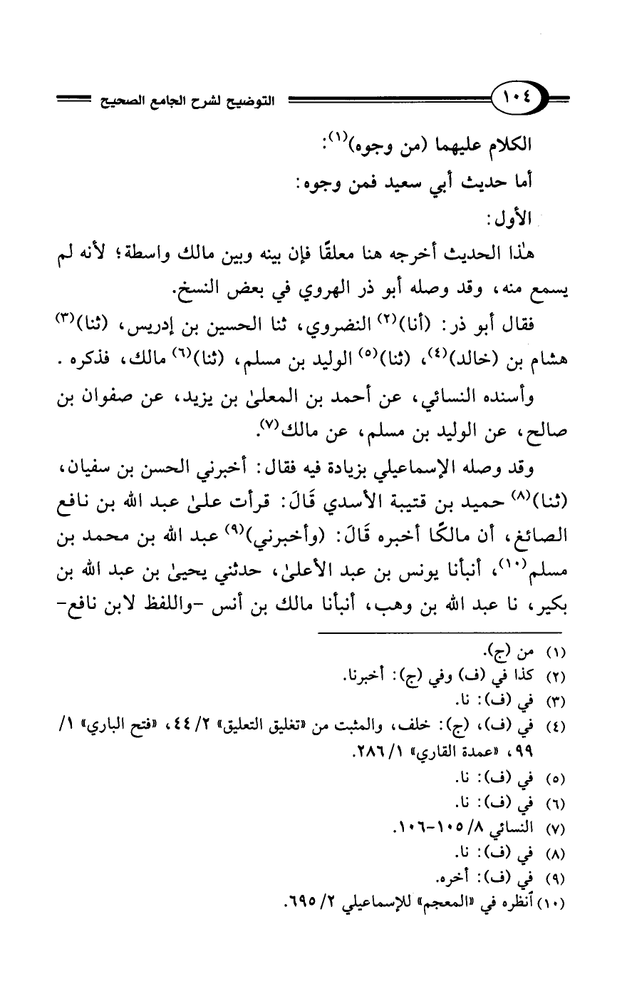 فقال أبو ذر: (أنا) (¬2) النضروي، ثنا الحسين بن إدريس، (ثنا) (¬3) هشام بن (خالد) (¬4)، (ثنا) (¬5) الوليد بن مسلم، (ثنا) (¬6) مالك، فذكره.