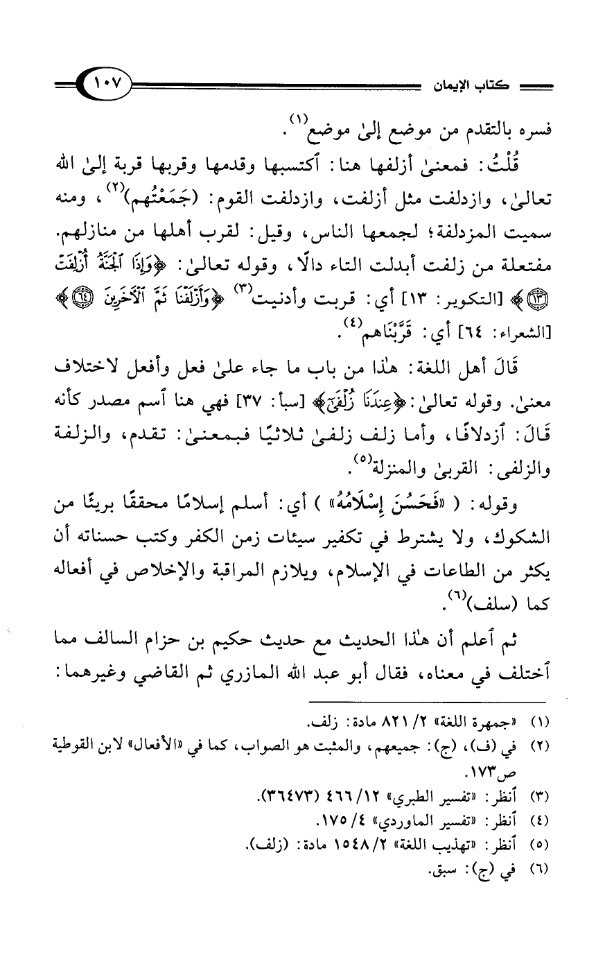 فسره بالتقدم من موضع إلى موضع (¬1). قُلْتُ: فمعنى أزلفها هنا: اكتسبها وقدمها وقربها قربة إلى الله تعالى، وازدلفت مثل أزلفت، وازدلفت القوم: (جَمَعْتُهم) (¬2)، ومنه سميت المزدلفة؛ لجمعها الناس، وقيل: لقرب أهلها من منازلهم.