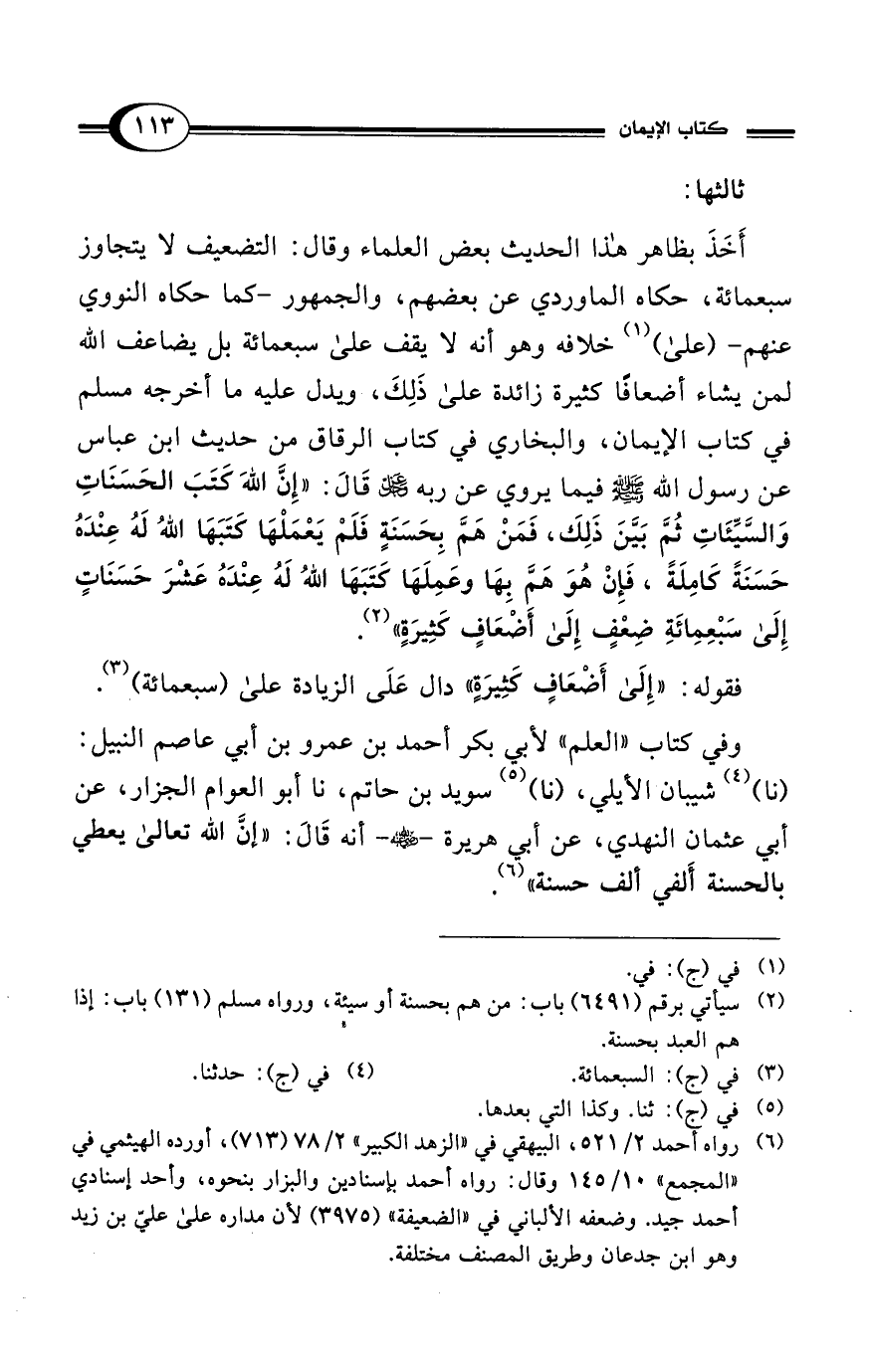 وفي كتاب "العلم" لأبي بكر أحمد بن عمرو بن أبي عاصم النبيل: (نا) (¬4) شيبان الأيلي، (نا) (¬5) سويد بن حاتم، نا أبو العوام الجزار، عن أبي عثمان النهدي، عن أبي هريرة - رضي الله عنه - أنه قَالَ: "إنَّ الله تعالى يعطي بالحسنة أَلفي ألف حسنة" (¬6).