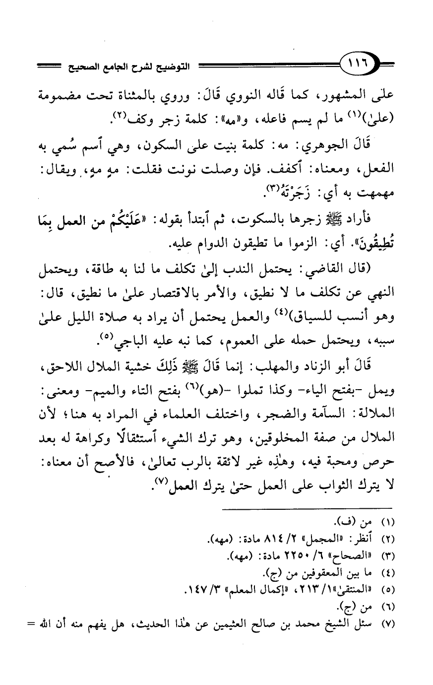 فأراد - صلى الله عليه وسلم - زجرها بالسكوت، ثم ابتدأ بقوله: "عَلَيْكُمْ من العمل بِمَا تُطِيقُونَ". أي: الزموا ما تطيقون الدوام عليه.