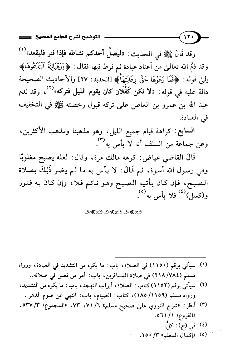 وقد ذمَّ الله تعالى من اعتاد عبادة ثم فرط فيها فقال: {وَرَهْبَانِيَّةً ابْتَدَعُوهَا} إلى قوله: {فَمَا رَعَوْهَا حَقَّ رِعَايَتِهَا} [الحديد: 27]، والأحاديث الصحيحة دالة عليه في قوله: "لا تكن كَفُلَان كان يقوم الليل فتركه" (¬2)، وقد ندم عبد الله بن عمرو بن العاص على تركه قبول رخصته - صلى الله عليه وسلم - في التخفيف في العبادة.