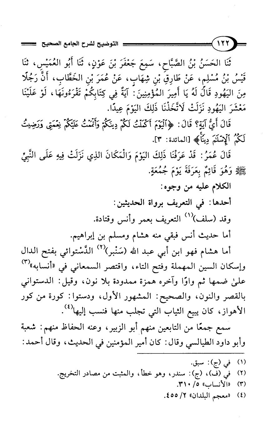 ثنَا الحَسَنُ بْنُ الصَّبَّاحِ، سَمِعَ جَعْفَرَ بْنَ عَوْنٍ، ثنَا أَبُو العُمَيْسِ، ثنَا قَيْسُ بْنُ مُسْلِمٍ، عَنْ طَارِقِ بْنِ شِهَاب، عَنْ عُمَرَ بْنِ الخَطَّابِ، أَنَّ رَجُلًا مِنَ اليَهُودِ قَالَ لَهُ يَا أَمِيرَ المُؤْمِنِينَ. آيَةٌ فِي كِتَابِكُمْ تَقْرَءُونَهَا، لَوْ عَلَيْنَا مَعْشَرَ اليَهُودِ نَزَلَتْ لَاتَخَذْنَا ذَلِكَ اليَوْمَ عِيدًا.