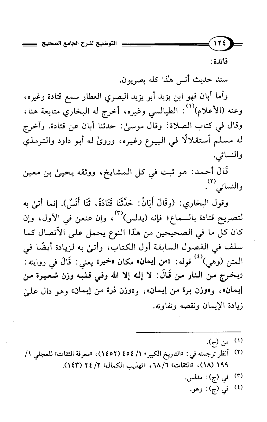 وقول البخاري: (وقَالَ أَبَانُ: حَدَّثنَا قَتَادَةُ، ثنَا أَنَسٌ). إنما أتى به لتصريح قتادة بالسماع؛ فإنه (يدلس) (¬3)، وإن عنعن في الأول، وإن كان كل ما في الصحيحين من هذا النوع يحمل على الاتصال كما سلف في الفصول السابقة أول الكتاب، وأتى به لزيادة أيضًا في المتن (وهي) (¬4) قؤله: "من إيمان" وكان "خير" يعني: قَالَ في روايته: "يخرج من النار من قَالَ: لا إلة إلا الله وفي قلبه وزن شعيرة من إيمان"، و"وزن برة من إيمان"، و"وزن ذرة من إيمان" وهو دال على زيادة الإيمان ونقصه وتفاوته.