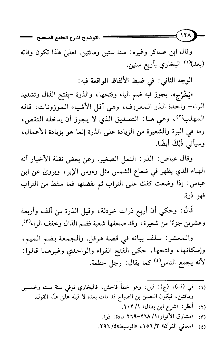 قَالَ: وحكي أن أربع ذرات خردلة، وقيل الذرة من ألف وأربعة وعشرين جزءًا من شعيرة، وقد صحفها شعبة فضم الذال وخفف الراء (¬3).