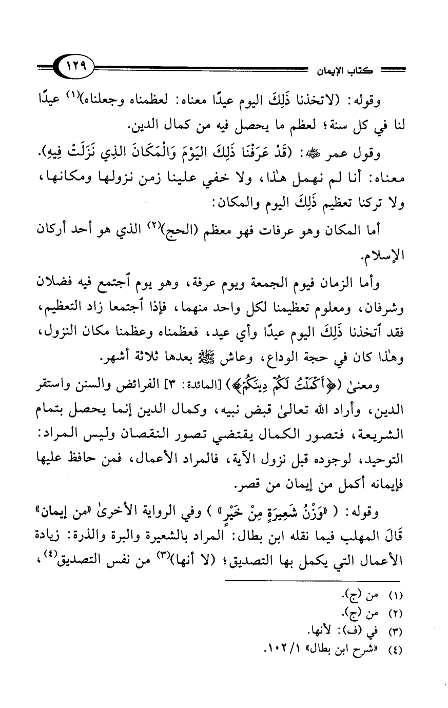 ومعنى {أَكْمَلْتُ لَكُمْ دِينَكُمْ} [المائدة: 3] الفرائض والسنن واستقر الدين، وأراد الله تعالى قبض نبيه، وكمال الدين إنما يحصل بتمام الشريعة، فتصور الكمال يقتضي تصور النقصان وليس المراد: التوحيد، لوجوده قبل نزول الآية، فالمراد الأعمال، فمن حافظ عليها فإيمانه أكمل من إيمان من قصر.