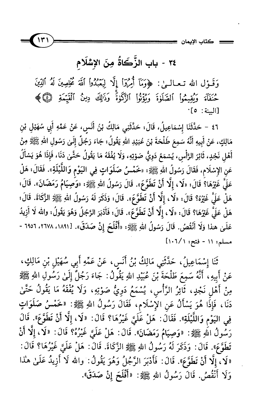46 - حَدَّثَنَا إِسْمَاعِيلُ، قَالَ: حَدَّثَنِى مَالِكُ بْنُ أَنَسٍ، عَنْ عَمِّهِ أَبِي سُهَيْلِ بْنِ مَالِكٍ، عَنْ أَبِيهِ أَنَّهُ سَمِعَ طَلْحَةَ بْنَ عُبَيْدِ اللهِ يَقُولُ: جَاءَ رَجُلٌ إِلَى رَسُولِ اللهِ - صلى الله عليه وسلم - مِنْ أَهْلِ نَجْدٍ، ثَائِرُ الرَّأْسِ، يُسْمَعُ دَوِيُّ صَوْتِهِ، وَلاَ يُفْقَهُ مَا يَقُولُ حَتَّى دَنَا، فَإِذَا هُوَ يَسْأَلُ عَنِ الإِسْلاَمِ فَقَالَ رَسُولُ اللهِ - صلى الله عليه وسلم -: "خَمْسُ صَلَوَاتٍ فِي الْيَوْمِ وَاللَّيْلَةِ". فَقَالَ هَلْ عَلَيَّ غَيْرُهَا؟ قَالَ: "لاَ، إِلاَّ أَنْ تَطَوَّعَ". قَالَ رَسُولُ اللهِ - صلى الله عليه وسلم -: "وَصِيَامُ رَمَضَانَ". قَالَ: هَلْ عَلَيَّ غَيْرُهُ؟ قَالَ: "لاَ، إِلاَّ أَنْ تَطَوَّعَ". قَالَ: وَذَكَرَ لَهُ رَسُولُ اللهِ - صلى الله عليه وسلم - الزَّكَاةَ. قَالَ: هَلْ عَلَيَّ غَيْرُهَا؟ قَالَ: "لاَ، إِلاَّ أَنْ تَطَوَّعَ". قَالَ فَأَدْبَرَ الرَّجُلُ وَهُوَ يَقُولُ: وَاللهِ لاَ أَزِيدُ عَلَى هَذَا وَلاَ أَنْقُصُ. قَالَ رَسُولُ اللهِ - صلى الله عليه وسلم -: "أَفْلَحَ إِنْ صَدَقَ". [1891، 2678، 6956 - مسلم: 11 - فتح: 1/ 106]