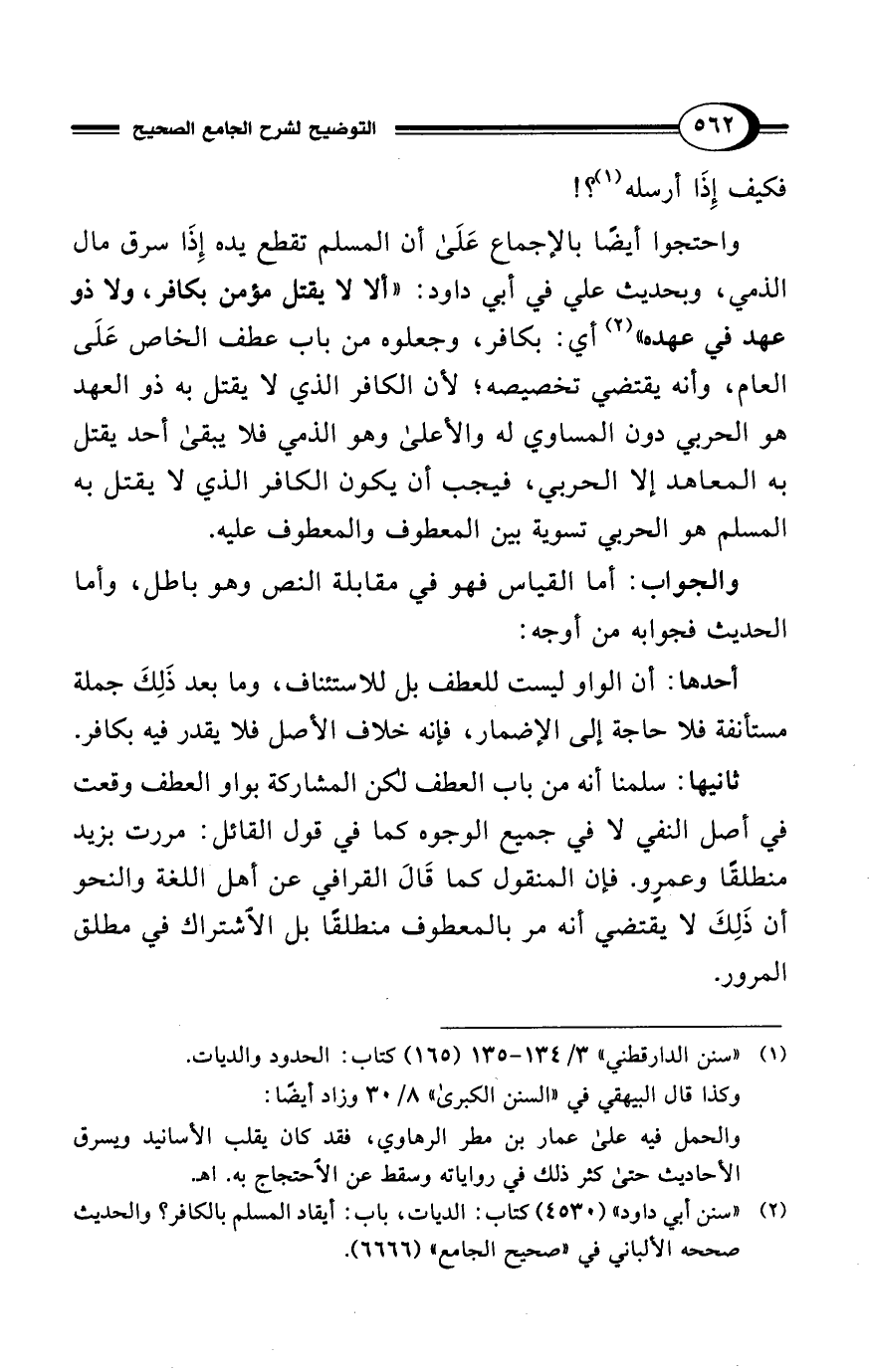 (¬2) "سنن أبي داود" (4530) كتاب: الديات، باب: أيقاد المسلم بالكافر؟ والحديث صححه الألباني في "صحيح الجامع" (6666).
