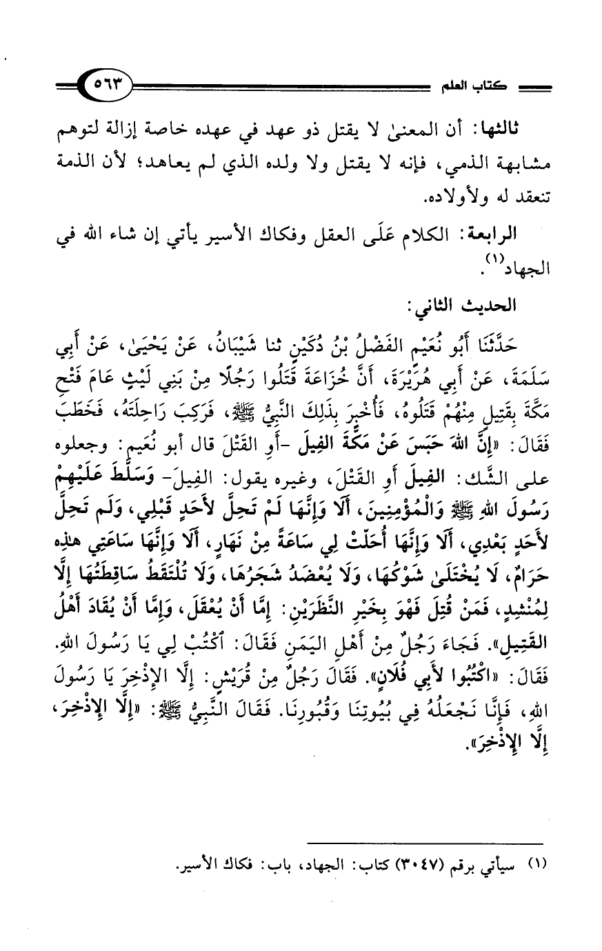 حَدَّثَنَا أَبُو نُعَيْمٍ الفَضْلُ بْنُ دُكَيْنٍ ثنا شَيْبَانُ، عَنْ يَحْيَى، عَنْ أَبِي سَلَمَةَ، عَنْ أَبِي هُرَيْرَةَ، أَنَّ خُزَاعَةَ قَتَلُوا رَجُلًا مِنْ بَنِي لَيْثٍ عَامَ فَتْحِ مَكَّةَ بِقَتِيلٍ مِنْهُمْ قَتَلُوهُ، فَأُخْبِرَ بِذَلِكَ النَّبِيُّ - صلى الله عليه وسلم -، فَرَكِبَ رَاحِلَتَهُ، فَخَطَبَ فَقَالَ: "إِنَّ اللهَ حَبَسَ عَنْ مَكَّةَ الفِيلَ -أَوِ القَتْلَ قال أبو نُعَيمٍ: وجعلوه على الشَّك؟ الفِيلَ أَوِ القَتْلَ، وغيره يقول: الفِيلَ- وَسَلَّطَ عَلَيْهِمْ رَسُولَ اللهِ - صلى الله عليه وسلم - وَالْمُؤْمِنِينَ، أَلا وَإِنَّهَا لَمْ تَحِلَّ لأَحَدٍ قَبْلِي، وَلَم تَحِلَّ لأَحَدٍ بَعْدِي، أَلَا وَإِنَّهَا أُحَلّتْ لِي سَاعَةً مِنْ نَهَارٍ، أَلَا وَإِنَّهَا سَاعَتِي هذِه حَرَامٌ، لَا يُخْتَلَى شَوْكُهَا، وَلَا يُعْضَدُ شَجَرُهَا، وَلَا تُلْتَقَطُ سَاقِطَتُهَا إِلَّا لِمُنْشِدٍ، فَمَنْ قُتِلَ فَهْوَ بِخَيْرِ النَّظَرَيْنِ: إِمَّا أَنْ يُعْقَلَ، وَإِمَّا أَنْ يُقَادَ أَهْلُ القَتِيلِ". فَجَاءَ رَجُلٌ مِنْ أَهْلِ اليَمَنِ فَقَالَ: اكْتُبْ لِي يَا رَسُولَ اللهِ. فَقَالَ: "اكْتُبُوا لأَبِي فُلَانٍ". فَقَالَ رَجُلٌ مِن قُرَيْشٍ: إِلَّا الإِذْخِرَ يَا رَسُولَ اللهِ، فَإِنَّا نَجْعَلُهُ فِي بُيُوتِنَا وَقُبُورِنَا. فَقَالَ النَّبِيُّ - صلى الله عليه وسلم -: "إِلَّا الإِذْخِرَ، إِلَا الِاذْخِرَ".