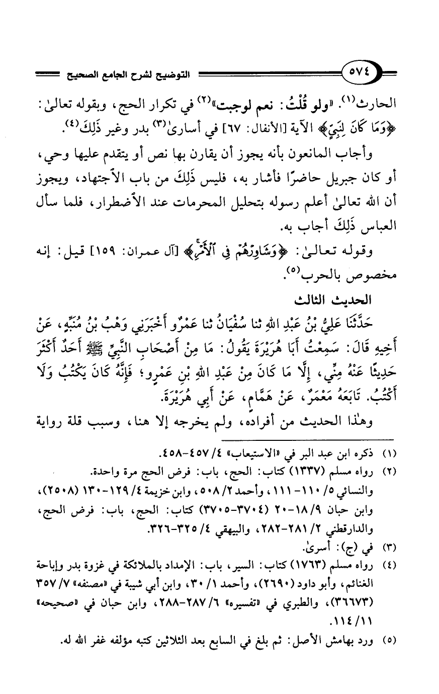الحارث (¬1). "ولو قُلْتُ: نعم لوجبت" (¬2) في تكرار الحج، وبقوله تعالى: {مَا كَانَ لِنَبِيٍّ} الآية [الأنفال: 67] في أسارى (¬3) بدر وغير ذَلِكَ (¬4).