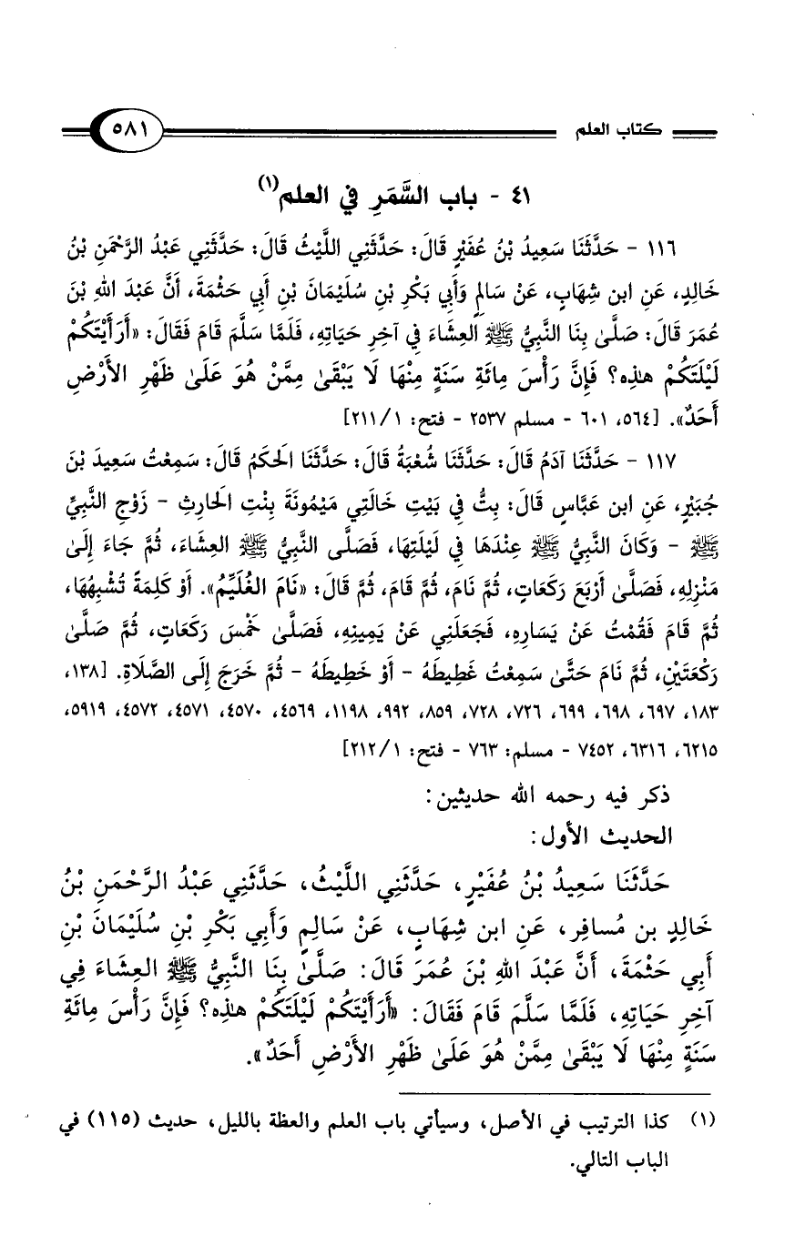 116 - حَدَّثَنَا سَعِيدُ بْنُ عُفَيْرٍ قَالَ: حَدَّثَنِي اللَّيْثُ قَالَ: حَدَّثَنِي عَبْدُ الرَّحْمَنِ بْنُ خَالِدٍ، عَنِ ابن شِهَابٍ، عَنْ سَالِمٍ وَأَبِي بَكْرِ بْنِ سُلَيمَانَ بْنِ أَبِي حَثْمَةَ، أَنَّ عَبْدَ اللهِ بْنَ عُمَرَ قَالَ: صَلَّى بِنَا النَّبِيُّ - صلى الله عليه وسلم - العِشَاءَ فِي آخِرِ حَيَاتِهِ، فَلَمَّا سَلَّمَ قَامَ فَقَالَ: "أَرَأَيْتَكُمْ لَيْلَتَكُمْ هذِه؟ فَإِن رَأْسَ مِائَةِ سَنَةٍ مِنْهَا لَا يَبْقَى مِمَّنْ هُوَ عَلَى ظَهْرِ الأَرْضِ أَحَدٌ". [564، 601 - مسلم 2537 - فتح: 1/ 211]