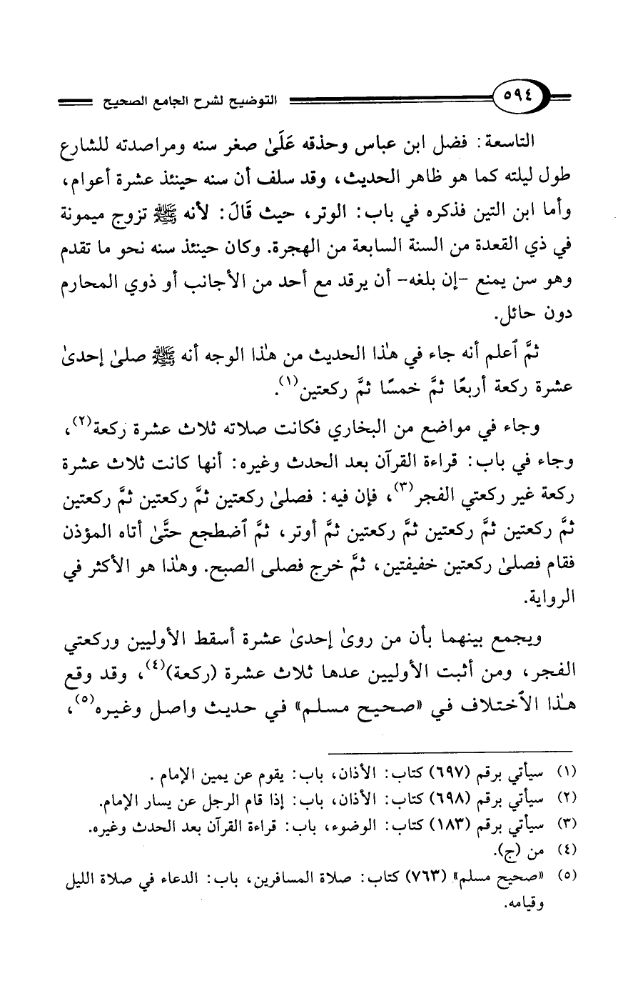 ثمَّ اعلم أنه جاء في هذا الحديث من هذا الوجه أنه - صلى الله عليه وسلم - صلى إحدى عشرة ركعة أربعًا ثمَّ خمسًا ثمَّ ركعتين (¬1).
