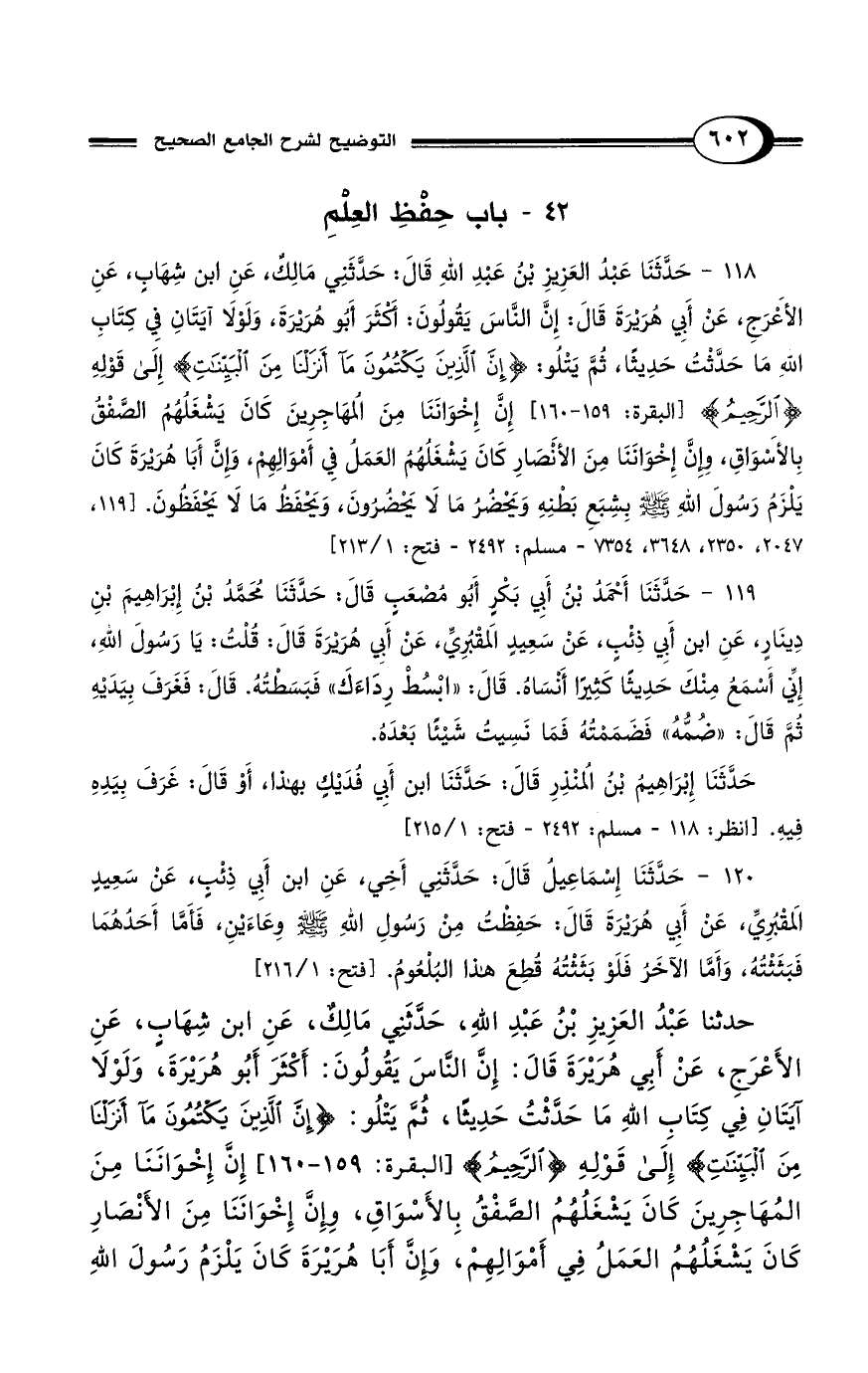 118 - حَدَّثَنَا عَبْدُ العَزِيزِ بْنُ عَبْدِ اللهِ قَالَ: حَدَّثَنِي مَالِكٌ، عَنِ ابن شِهَابٍ، عَنِ الأعرَجِ، عَنْ أَبِي هُرَيْرَةَ قَالَ: إِنَّ النَّاسَ يَقُولُونَ: أَكْثَرَ أَبُو هُرَيْرَةَ، وَلَوْلَا آيَتَانِ فِي كِتَابِ اللهِ مَا حَدَّثْتُ حَدِيثًا، ثُمَّ يَتْلُو: {إِنَّ الَّذِينَ يَكْتُمُونَ مَا أَنْزَلْنَا مِنَ الْبَيِّنَاتِ} إِلَى قَوْلِهِ {الرَّحِيمُ} [البقرة: 159 - 160] إِنَّ إِخْوَانَنَا مِنَ الُمهَاجِرِينَ كَانَ يَشْغَلُهُمُ الصَّفْقُ بِالأسوَاقِ، وإِنَّ إِخْوَانَنَا مِنَ الأَنْصَارِ كَانَ يَشْغَلُهُمُ العَمَلُ فِي أَمْوَالِهِمْ، وَإنَّ أَبَا هُرَيْرَةَ كَانَ يَلْزَمُ رَسُولَ اللهِ - صلى الله عليه وسلم - بِشِبَعِ بَطْنِهِ وَيَحْضُرُ مَا لَا يَحْضرُونَ، وَيحْفَظُ مَا لَا يَحْفَظُونَ. [119، 2047، 2350، 3648، 7354 - مسلم: 2492 - فتح: 1/ 213]