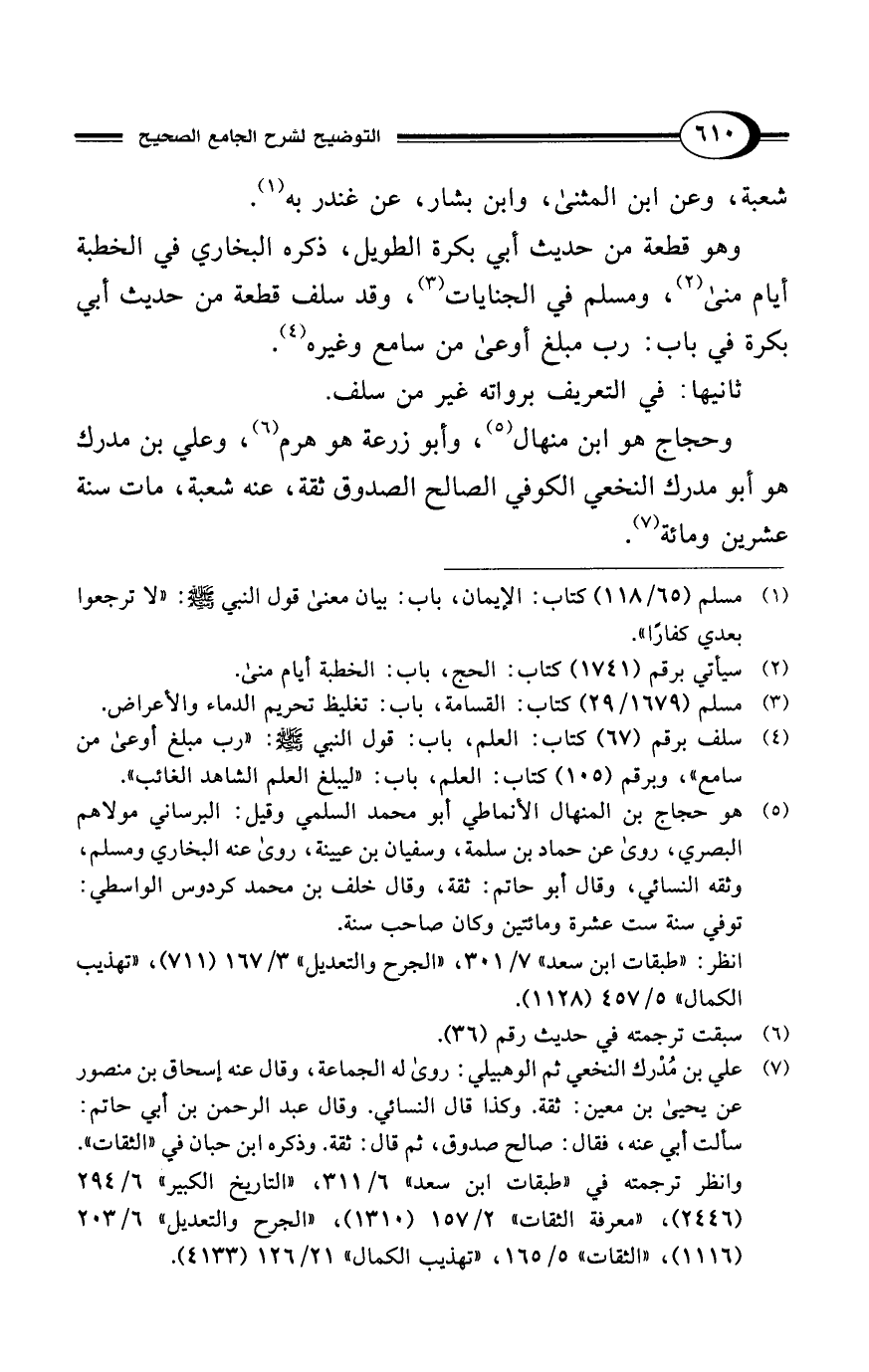(¬4) سلف برقم (67) كتاب: العلم، باب: قول النبي - صلى الله عليه وسلم -: "رب مبلغ أوعى من سامع"، وبرقم (105) كتاب: العلم، باب: "ليبلغ العلم الشاهد الغائب".