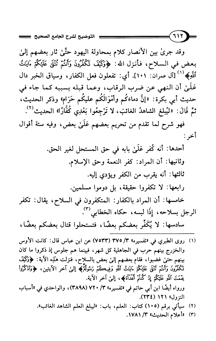 وقد جرى بين الأنصار كلام بمحاولة اليهود حتَّى ثار بعضهم إلى بعض في السلاح، فأنزل الله: {وَكَيْفَ تَكْفُرُونَ وَأَنْتُمْ تُتْلَى عَلَيْكُمْ آيَاتُ اللَّهِ} (¬1) [آل عمران: 101]. أي: تفعلون فعل الكفار، وسياق الخبر دال عَلَى أن النهي عن ضرب الرقاب، وعما قبله بسببه كما جاء في حديث أبي بكرة: "إنَّ دماءَكُم وأمْوَالَكُم عليكُم حَرَام" وذكر الحديث، ثمَّ قَالَ: "ليُبلغ الشاهدُ الغائبَ، لا تَرْجِعُوا بَعْدِي كُفَّارًا" الحديث (¬2).