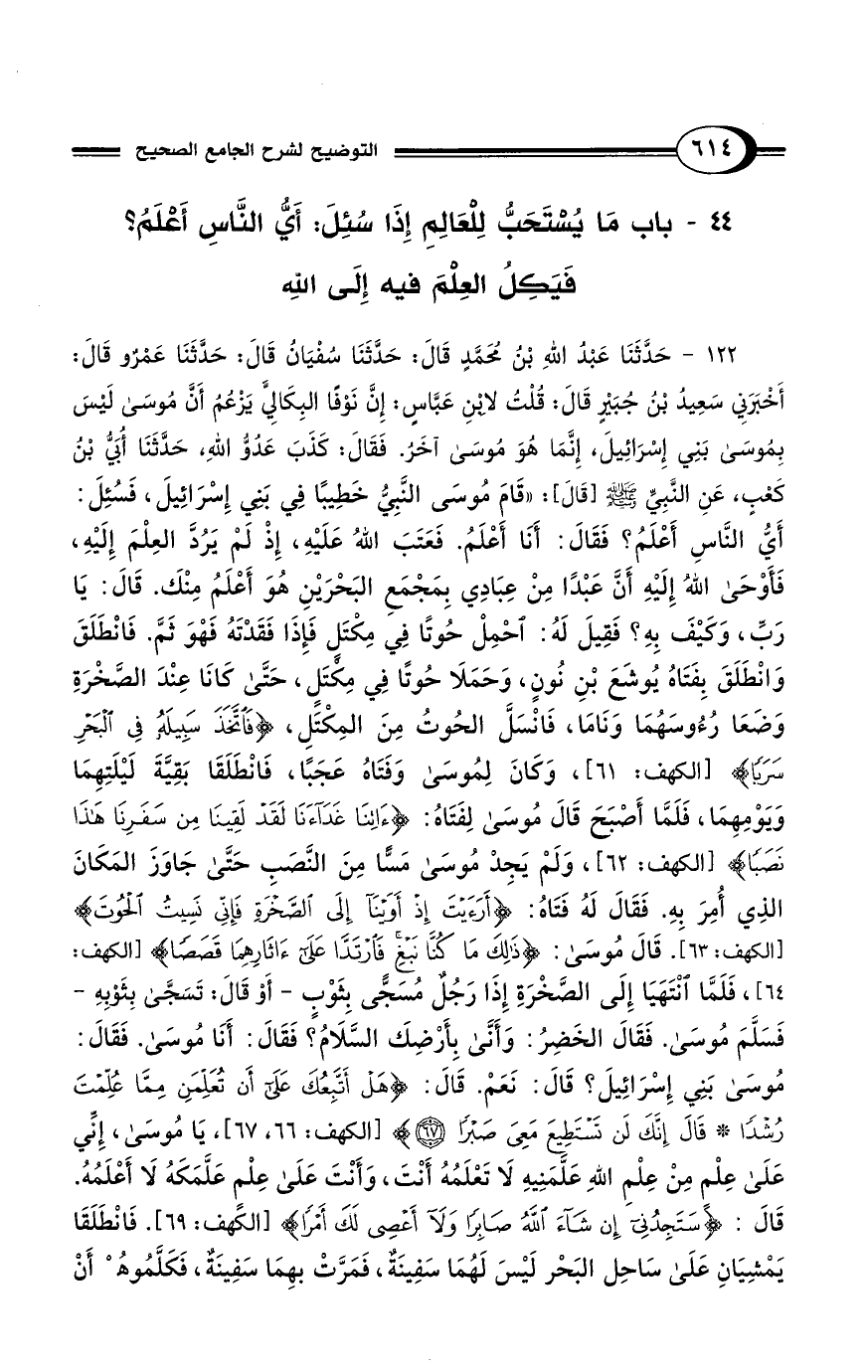 122 - حَدَّثَنَا عَبْدُ اللهِ بْنُ مُحَمَّدٍ قَالَ: حَدَّثَنَا سُفْيَانُ قَالَ: حَدَّثَنَا عَمْرٌو قَالَ: أَخْبَرَنِي سَعِيدُ بْنُ جُبَيْرٍ قَالَ: قُلْتُ لابْنِ عَبَّاسٍ: إِنَّ نَوْفًا البِكَالِيَّ يَزْعُمُ أَنَّ مُوسَى لَيْسَ بِمُوسَى بَنِي إِسْرَائِيلَ، إِنَّمَا هُوَ مُوسَى آخَرُ. فَقَالَ: كَذَبَ عَدُوُّ اللهِ، حَدَّثَنَا أُبَيُّ بْنُ كَعْبٍ، عَنِ النَّبِيِّ - صلى الله عليه وسلم -[قَالَ]: "قَامَ مُوسَى النَّبِيُّ خَطِيبًا فِي بَني إِسْرَائِيلَ، فَسُئِلَ: أَيُّ النَّاسِ أَعْلَمُ؟ فَقَالَ: أَنَا أَعْلَمُ. فَعَتَبَ اللهُ عَلَيْهِ، إِذْ لَمْ يَرُدَّ العِلْمَ إِلَيهِ، فَأَوْحَى الله إِلَيْهِ أَن عَبْدًا مِنْ عِبَادِي بِمَجْمَعِ البَحْرَيْنِ هُوَ أَعْلَمُ مِنْكَ. قَالَ: يَا رَبِّ، وَكَيْفَ بِهِ؟ فَقِيلَ لَهُ: احْمِلْ حُوتًا فِي مِكْتَل فَإِذَا فَقَدْتَهُ فهْوَ ثَمَّ. فَانْطَلَقَ وَانْطَلَقَ بِفَتَاهُ يُوشَعَ بْنِ نُونٍ، وَحَمَلَا حُوتًا فِي مِكَتَلِ، حَتَّى كَانَا عِنْدَ الصَّخْرَةِ وَضَعَا رُءُوسَهُمَا وَنَامَا، فَانْسَل الحُوتُ مِنَ المِكْتَلِ، {فَاتَّخَذَ سَبِيلَهُ فِي الْبَحْرِ سَرَبًا} [الكهف: 61]، وَكَانَ لِمُوسَى وَفَتَاهُ عَجَبًا، فَانْطَلَقَا بَقِيَّةَ لَيْلَتِهِمَا وَيَوْمِهِمَا، فَلَمَّا أَصْبَحَ قَالَ مُوسَى لِفَتَاهُ: {آتِنَا غَدَاءَنَا لَقَدْ لَقِينَا مِنْ سَفَرِنَا هَذَا نَصَبًا} [الكهف: 62]، وَلَمْ يَجِدْ مُوسَى مَسًّا مِنَ النَّصَب حَتَّى جَاوَزَ المَكَانَ الذِي أُمِرَ بهِ. فَقَالَ لَهُ فَتَاهُ: {أَرَأَيْتَ إِذْ أَوَيْنَا إِلَى الصَّخْرَةِ فَإِنِّي نَسِيتُ الْحُوتَ} [الكهف: 63]. قَالَ مُوسَى: {ذَلِكَ مَا كُنَّا نَبْغِ فَارْتَدَّا عَلَى آثَارِهِمَا قَصَصًا} [الكهف: 64]، فَلَمَّا انْتَهَيَا إِلَى الصَّخْرَةِ إِذَا رَجُلٌ مُسَجًّى بِثَوْبٍ -أَوْ قَالَ: تَسَجَّى بِثَوْبِهِ- فَسَلَّمَ مُوسَى. فَقَالَ الخَضِرُ: وَأَنَّى بِأَرْضِكَ السَّلَامُ؟ فَقَالَ: أَنَا مُوسَى. فَقَالَ: مُوسَى بَنِي إِسْرَائِيلَ؟ قَالَ: نَعَمْ. قَالَ: {هَلْ أَتَّبِعُكَ عَلَى أَنْ تُعَلِّمَنِ مِمَّا عُلِّمْتَ رُشْدًا (66) قَالَ إِنَّكَ لَنْ تَسْتَطِيعَ مَعِيَ صَبْرًا (67)} [الكهف: 66، 67]، يَا مُوسَى، إِنِّي عَلَى عِلْم مِن عِلْمِ اللهِ عَلّمَنِيهِ لَا تَعْلَمُهُ أَنْتَ، وَأَنْتَ عَلَى عِلْم عَلَّمَكَهُ لَا أَعْلَمُهُ. قَال: {سَتَجِدُنِي إِنْ شَاءَ اللَّهُ صَابِرًا وَلَا أَعْصِي لَكَ أَمْرًا} [الكهف: 69]. فَانْطَلَقَا يَمْشِيَانِ عَلَى سَاحِل البَحْر لَيْسَ لَهُمَا سَفِينَةٌ، فَمَرَّتْ بهِمَا سَفِينَةٌ، فَكَلَّمُوهُمْ أَنْ