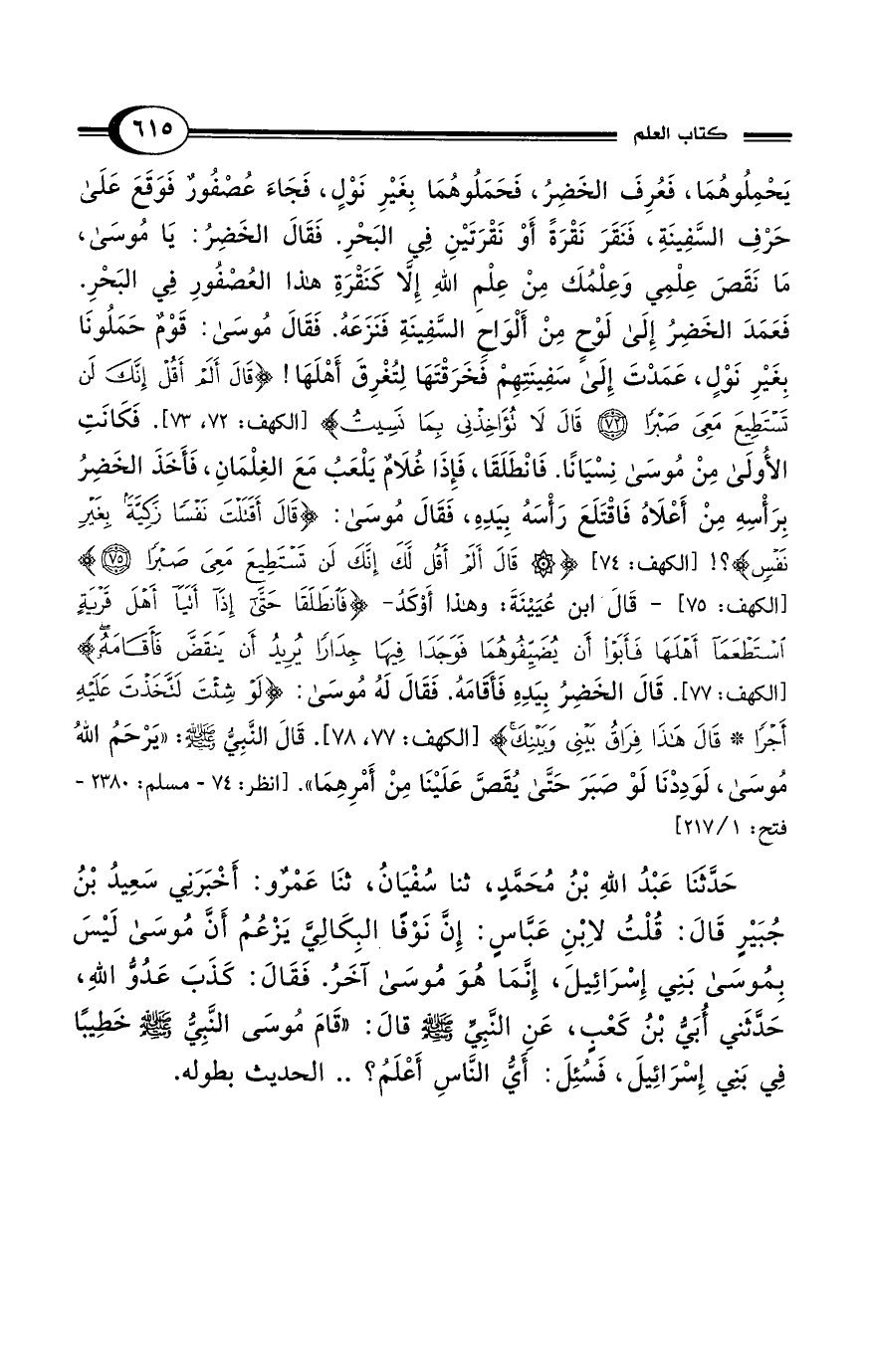 يَحْمِلُوهُمَا، فَعُرِفَ الخَضِرُ، فَحَمَلُوهُمَا بِغَيْرِ نَوْلٍ، فَجَاءَ عُصْفُورٌ فَوَقَعَ عَلَى حَرْفِ السَّفِينَةِ، فَنَقَرَ نَقْرَةً أَوْ نَقْرَتَيْنِ فِي البَحْرِ. فَقَالَ الخَضِرُ: يَا مُوسَى، مَا نَقَصَ عِلْمِي وَعِلْمُكَ مِنْ عِلْمِ اللهِ إِلا كَنَقْرَةِ هذا العُصْفُورِ فِي البَحْرِ. فَعَمَدَ الخَضِرُ إِلَى لَوْحٍ مِنْ أَلْوَاحٍ السَّفِينَةِ فَنَزَعَهُ. فَقَالَ مُوسَى: قَوْمٌ حَمَلُونَا بِغَيْرِ نَوْلٍ، عَمَدْتَ إِلَىَ سَفِينَتِهِمْ فخَرَقْتَهَا لِتُغْرِقَ أَهْلَهَا! {قَالَ أَلَمْ أَقُلْ إِنَّكَ لَنْ تَسْتَطِيعَ مَعِيَ صَبْرًا (72) قَالَ لَا تُؤَاخِذْنِي بِمَا نَسِيتُ} [الكهف: 72، 73]. فَكَانَتِ الأولَى مِنْ مُوسَى نِسْيَانًا. فَانْطَلَقَا، فَإِذَا غُلَامٌ يَلْعَبُ مَعَ الغِلْمَانِ، فَأَخَذَ الخَضِرُ بِرَأْسِهِ مِنْ أَعْلَاهُ فَاقْتَلَعَ رَأْسَهُ بِيَدِهِ، فَقَالَ مُوسَى: {قَالَ أَقَتَلْتَ نَفْسًا زَكِيَّةً بِغَيْرِ نَفْسٍ}؟! [الكهف: 74] {قَالَ أَلَمْ أَقُلْ لَكَ إِنَّكَ لَنْ تَسْتَطِيعَ مَعِيَ صَبْرًا (75)} [الكهف: 75]- قَالَ ابن عُيَيْنَةَ: وهذا أَوْكَدُ- {فَانْطَلَقَا حَتَّى إِذَا أَتَيَا أَهْلَ قَرْيَةٍ اسْتَطْعَمَا أَهْلَهَا فَأَبَوْا أَنْ يُضَيِّفُوهُمَا فَوَجَدَا فِيهَا جِدَارًا يُرِيدُ أَنْ يَنْقَضَّ فَأَقَامَهُ} [الكهف: 77]. قَالَ الخَضِرُ بِيَدِهِ فَأقَامَة. فَقَالَ لَهُ مُوسَى: {لَوْ شِئْتَ لَاتَّخَذْتَ عَلَيْهِ أَجْرًا (77) قَالَ هَذَا فِرَاقُ بَيْنِي وَبَيْنِكَ} [الكهف: 77، 78]. قَالَ النَّبِيُّ - صلى الله عليه وسلم -: "يَرْحَمُ اللهُ مُوسَى، لَوَدِدْنَا لَوْ صَبَرَ حَتَّى يُقَصَّ عَلَيْنَا مِنْ أَمْرِهِمَا". [انظر: 74 - مسلم: 2380 - فتح: 1/ 217]