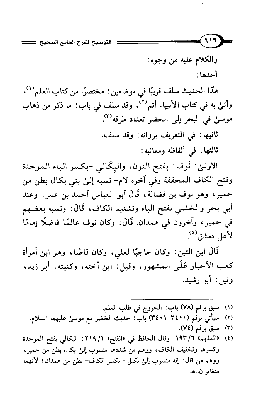 (¬4) "المفهم" 6/ 193. وقال الحافظ في "الفتح" 1/ 219: البكالي بفتح الموحدة وكسرها وتخفيف الكاف، ووهم من شددها منسوب إلى بكال بطن من حمير، ووهم من قال: إنه منسوب إلى بكيل -بكسر الكاف- بطن من همدان لأنهما متغايران. اهـ.