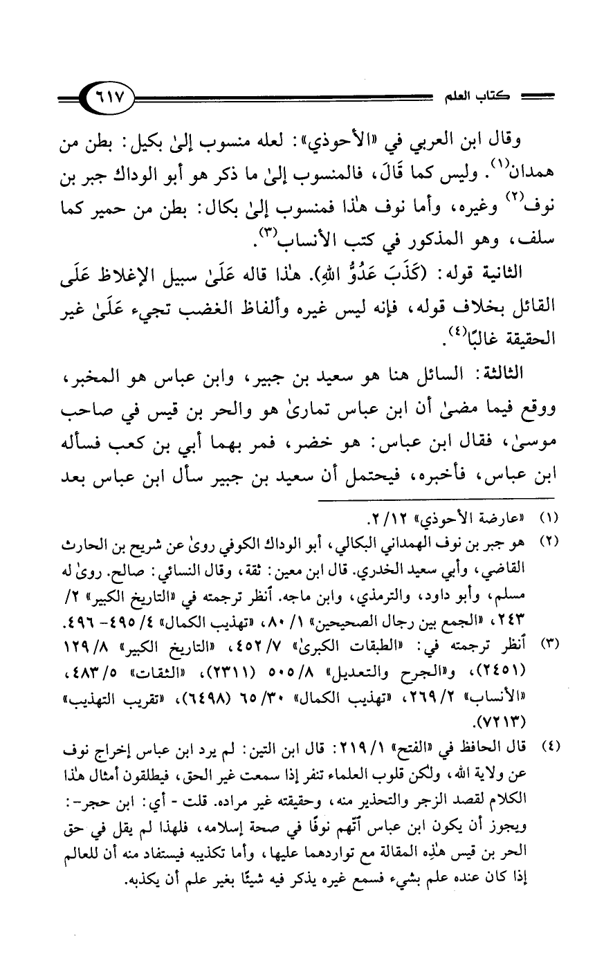 (¬4) قال الحافظ في "الفتح" 1/ 219: قال ابن التين: لم يرد ابن عباس إخراج نوف عن ولاية الله، ولكن قلوب العلماء تنفر إذا سمعت غير الحق، فيطلقون أمثال هذا الكلام لقصد الزجر والتحذير منه، وحقيقته غير مراده. قلت -أي: ابن حجر-: ويجوز أن يكون ابن عباس اتّهم نوفًا في صحة إسلامه، فلهذا لم يقل في حق الحر بن قيس هذِه المقالة مع تواردهما عليها، وأما تكذيبه فيستفاد منه أن للعالم إذا كان عنده علم بشيء فسمع غيره يذكر فيه شيئًا بغير علم أن يكذبه.