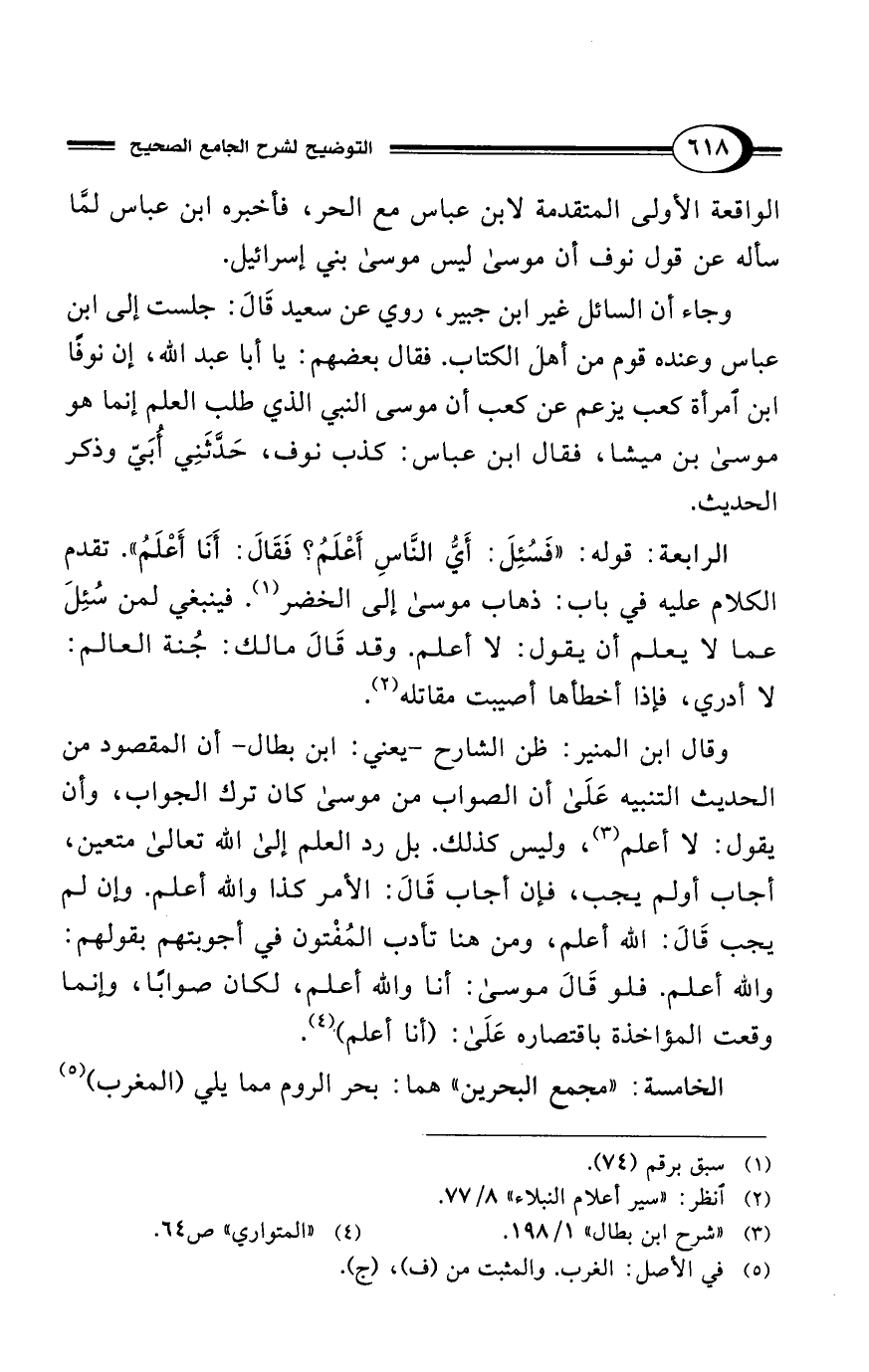 وقال ابن المنير: ظن الشارح -يعني: ابن بطال- أن المقصود من الحديث التنبيه عَلَى أن الصواب من موسى كان ترك الجواب، وأن يقول: لا أعلم (¬3)، وليس كذلك. بل رد العلم إلى الله تعالى متعين، أجاب أولم يجب، فإن أجاب قَالَ: الأمر كذا والله أعلم. وإن لم يجب قَالَ: الله أعلم، ومن هنا تأدب المُفْتون في أجوبتهم بقولهم: والله أعلم. فلو قَالَ موسى: أنا والله أعلم، لكان صوابًا، وإنما وقعت المؤاخذة باقتصاره عَلَى: (أنا أعلم) (¬4).
