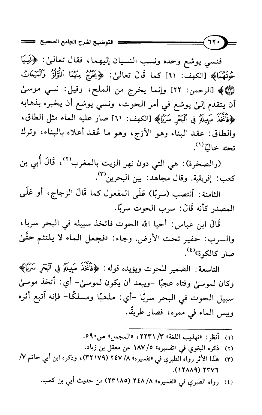 قَالَ ابن عباس: أحيا الله الحوت فاتخذ سبيله في البحر سربا، والسرب: حفير تحت الأرض. وجاء: "فجعل الماء لا يلتئم حتَّى صار كالكوة" (¬4).