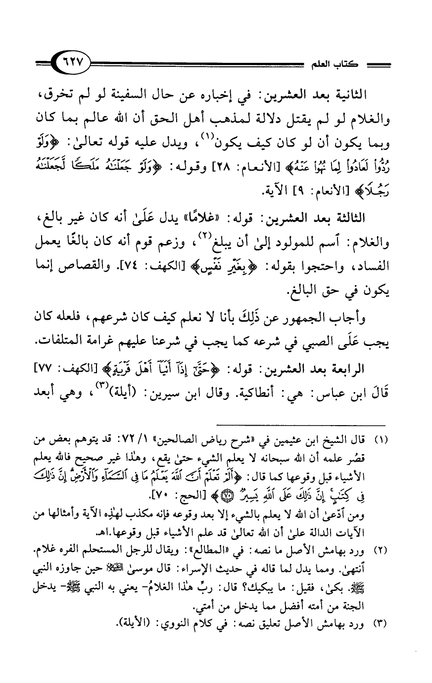 الثالثة بعد العشرين: قوله: "غلامًا" يدل عَلَى أنه كان غير بالغ، والغلام: اسم للمولود إلى أن يبلغ (¬2)، وزعم قوم أنه كان بالغًا يعمل الفساد، واحتجوا بقوله: {بِغَيْرِ نَفْسٍ} [الكهف: 74]. والقصاص إنما يكون في حق البالغ.