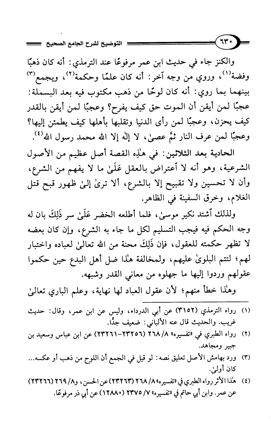 ولذلك اشتد نكير موسى، فلما أطلعه الخضر عَلَى سر ذَلِكَ بان له وجه الحكم فيه فيجب التسليم لكل ما جاء به الشرع، وإن كان بعضه لا تظهر حكمته للعقول، فإن ذَلِكَ محنة من الله تعالى لعباده واختبار لهم؛ لتتم البلوى عليهم، ولمخالفة هذا ضل أهل البدع حين حكموا عقولهم وردوا إليها ما جهلوه من معاني القدر وشبهه.