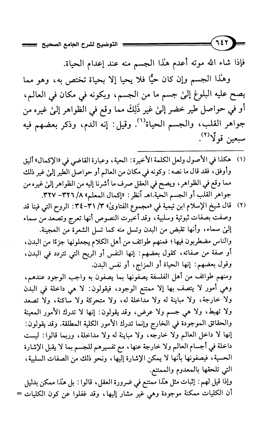 (¬1) هكذا في الأصول ولعل الكلمة الأخيرة: الحية، وعبارة القا ضي في "الإكمال" أليق وأوفق، فقد قال ما نصه: وكونه في مكان من العالم أو حواصل الطير إلى غير ذلك مما وقع في الظواهر، ويصح في العقل صرف ما أشرنا إليه من الظواهر إلى غيره من جواهر القلب أو الجسم الحية. اهـ. انظر: "إكمال المعلم" 8/ 326 - 327.