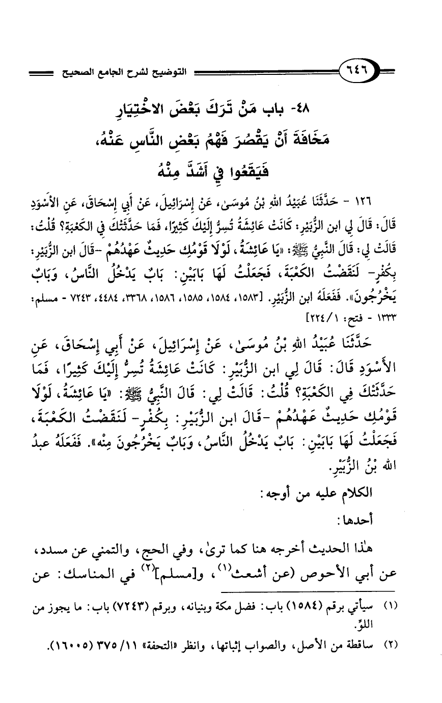 126 - حَدَّثَنَا عُبَيْدُ اللهِ بْن مُوسَى، عَنْ إِسْرَائِيلَ، عَنْ أَبِي إِسْحَاقَ، عَنِ الأسوَدِ قَالَ: قَالَ لِي ابن الزُّبَيْرِ: كَانَتْ عَائِشَةُ تسِرُّ إِلَيْكَ كَثِيرًا، فَمَا حَدَّثَتْكَ فِي الكعْبَةِ؟ قُلْتُ: قَالَتْ لِي: قَالَ النَّبِيُّ - صلى الله عليه وسلم -: "يَا عَائِشَةُ، لَوْلَا قَوْمُكِ حَدِيثٌ عَهْدُهُمْ -قَالَ ابن الزُّبَيْرِ: بِكُفْرٍ- لَنَقَضْتُ الكَعْبَةَ، فَجَعَلْتُ لَهَا بَابَيْنِ: بَابٌ يَدْخُلُ النَّاسُ، وَبَابٌ يَخْرُجُونَ". فَفَعَلَة ابن الزُّبَيْرِ. [1583، 1584، 1585، 1586، 3368، 4484، 7243 - مسلم: 1333 - فتح: 1/ 224]