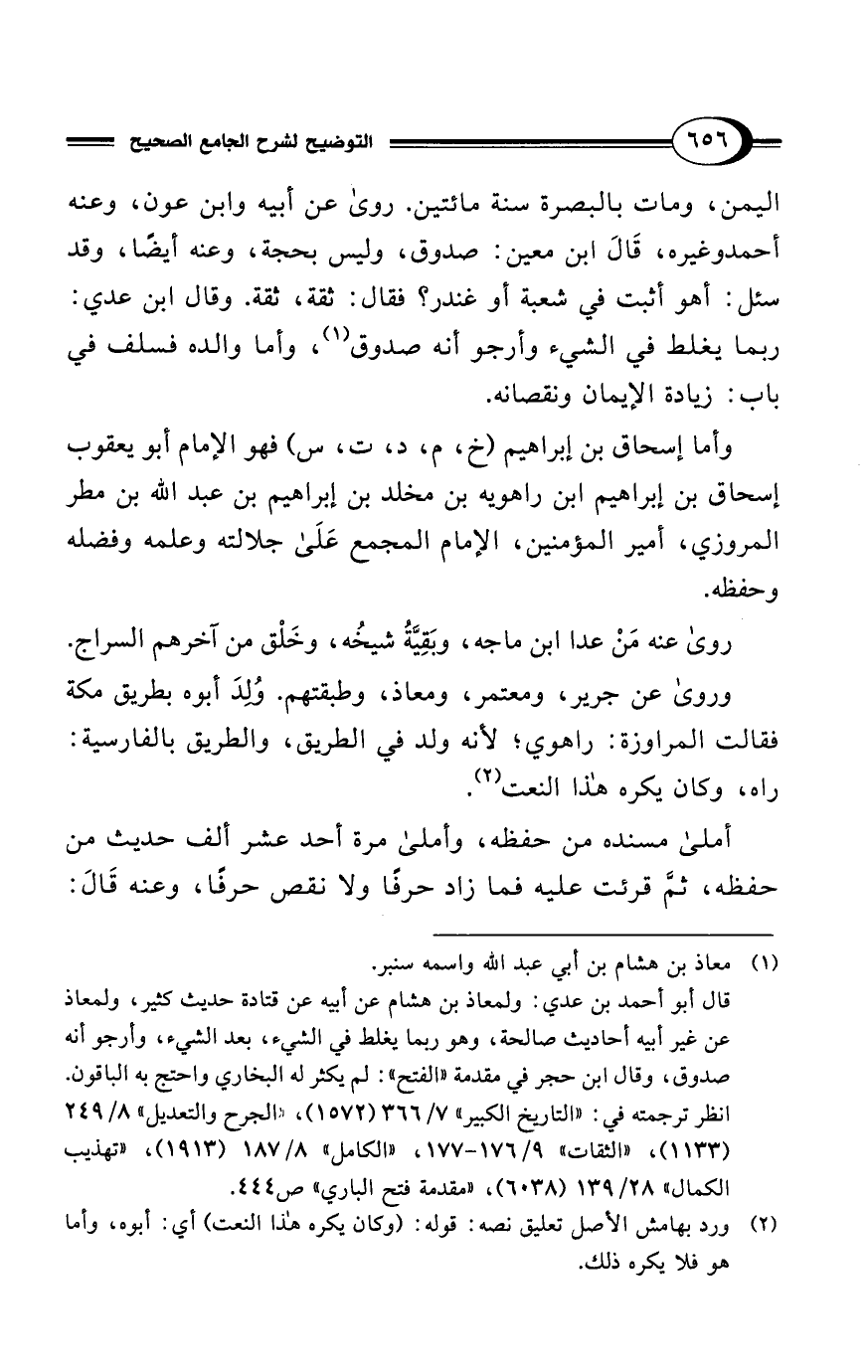 اليمن، ومات بالبصرة سنة مائتين. روى عن أبيه وابن عون، وعنه أحمد وغيره، قَالَ ابن معين: صدوق، وليس بحجة، وعنه أيضًا، وقد سئل: أهو أثبت في شعبة أو غندر؟ فقال: ثقة، ثقة. وقال ابن عدي: ربما يغلط في الشيء وأرجو أنه صدوق (¬1)، وأما والده فسلف في باب: زيادة الإيمان ونقصانه.