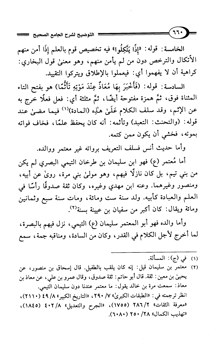 أما مُعتمر (ع) فهو ابن سليمان بن طرخان التيمي البصري لم يكن من بني تيم، بل كان نازلًا فيهم، وهو مولى بني مرة، روى عن أبيه، ومنصور وغيرهما. وعنه ابن مهدي وغيره، وكان ثقة صدوقًا رأسًا في العلم والعبادة كأبيه. ولد سنة ست ومائة، ومات سنة سبع وثمانين ومائة ويقال: كان أكبر من سفيان بن عيينة بسنة (¬2).