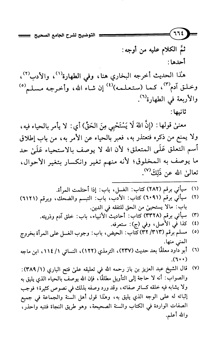 (¬7) قال الشيخ عبد العزيز بن باز رحمه الله في تعليقه على فتح الباري (1/ 389): والصواب: أنه لا حاجة إلى التأويل مطلقًا، فإن الله يوصف بالحياء الذي يليق به ولا يشابه فيه خلقه كسائر صفاته، وقد ورد وصفه بذلك في نصوص كثيرة؛ فوجب إثباته له على الوجه الذي يليق به، وهذا قول أهل السنة والجماعة في جميع الصفات الواردة في الكتاب والسنة الصحيحة، وهو طريق النجاة فتنبه واحذر، والله أعلم.