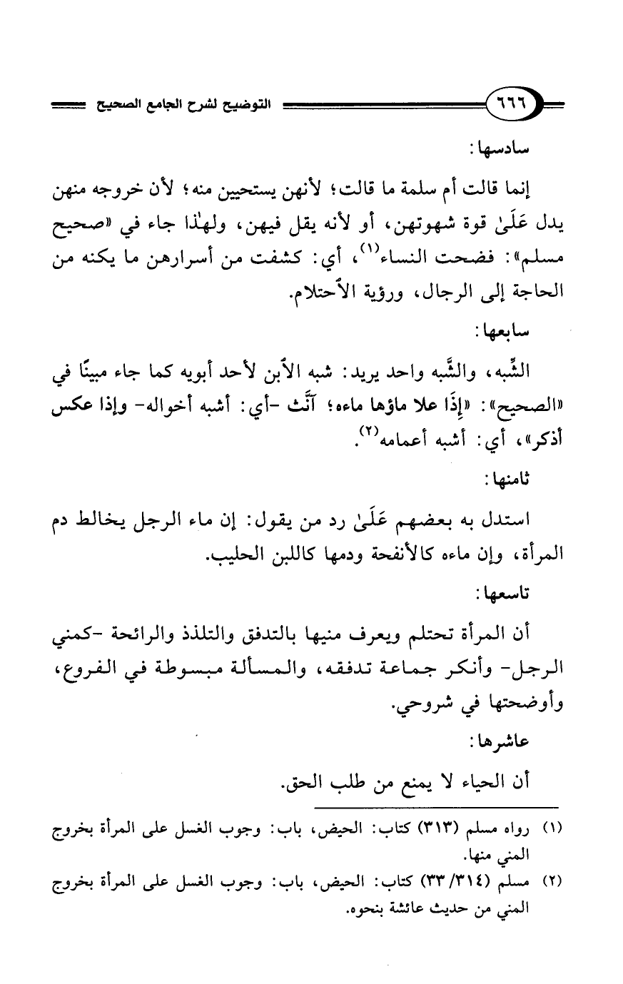 أن المرأة تحتلم ويعرف منيها بالتدفق والتلذذ والرائحة -كمني الرجل- وأنكر جماعة تدفقه، والمسألة مبسوطة في الفروع، وأوضحتها في شروحي.