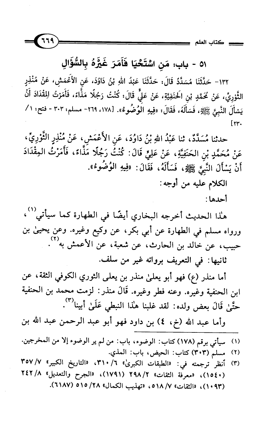 132 - حَدَّثَنَا مُسَدَّدٌ قَالَ: حَدَّثَنَا عَبْدُ اللهِ بْن دَاوُدَ، عَنِ الأعمَشِ، عَنْ مُنْذِرٍ الثَّوْرِيِّ، عَنْ مُحَمَّدٍ بنِ الَحنَفِيَّةِ، عَنْ عَلِيٍّ قَالَ: كُنْتُ رَجُلًا مَذَّاءً، فَأَمَرْتُ الِمقْدَادَ أَنْ يَسْأَلَ النَّبِيَّ - صلى الله عليه وسلم -، فَسَألَهُ، فَقَالَ: "فِيهِ الوُضوءُ". [178، 269 - مسلم: 303 - فتح: 1/ 230]
