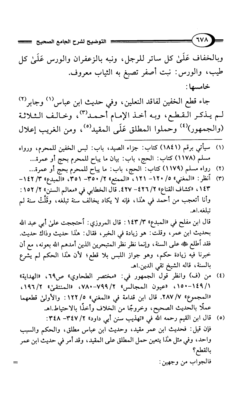 جاء قطع الخفين لفاقد النعلين، وفي حديث ابن عباس (¬1) وجابر (¬2) لم يذكر القطع، وبه أخذ الإمام أحمد (¬3)، وخالف الثلاثة (والجمهور) (¬4) وحملوا المطلق عَلَى المقيد (¬5)، ومن الغريب إعلال