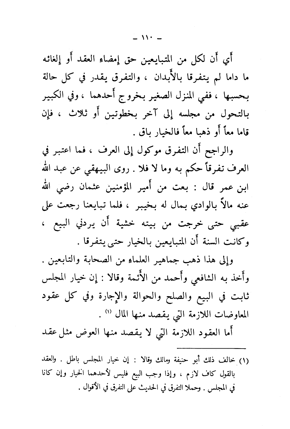 روى البيهقي عن عبد الله ابن عمر قال: بعت من أمير المؤمنين عثمان رضي الله عنه مالا بالوادي بمال له بخيبر، فلما تبايعنا رجعت على عقبي حتى خرجت من بيته خشية أن يردني البيع، وكانت السنة أن المتبايعين بالخيار حتى يتفرقا. وإلى هذا ذهب جماهير العلماء من الصحابة والتابعين.