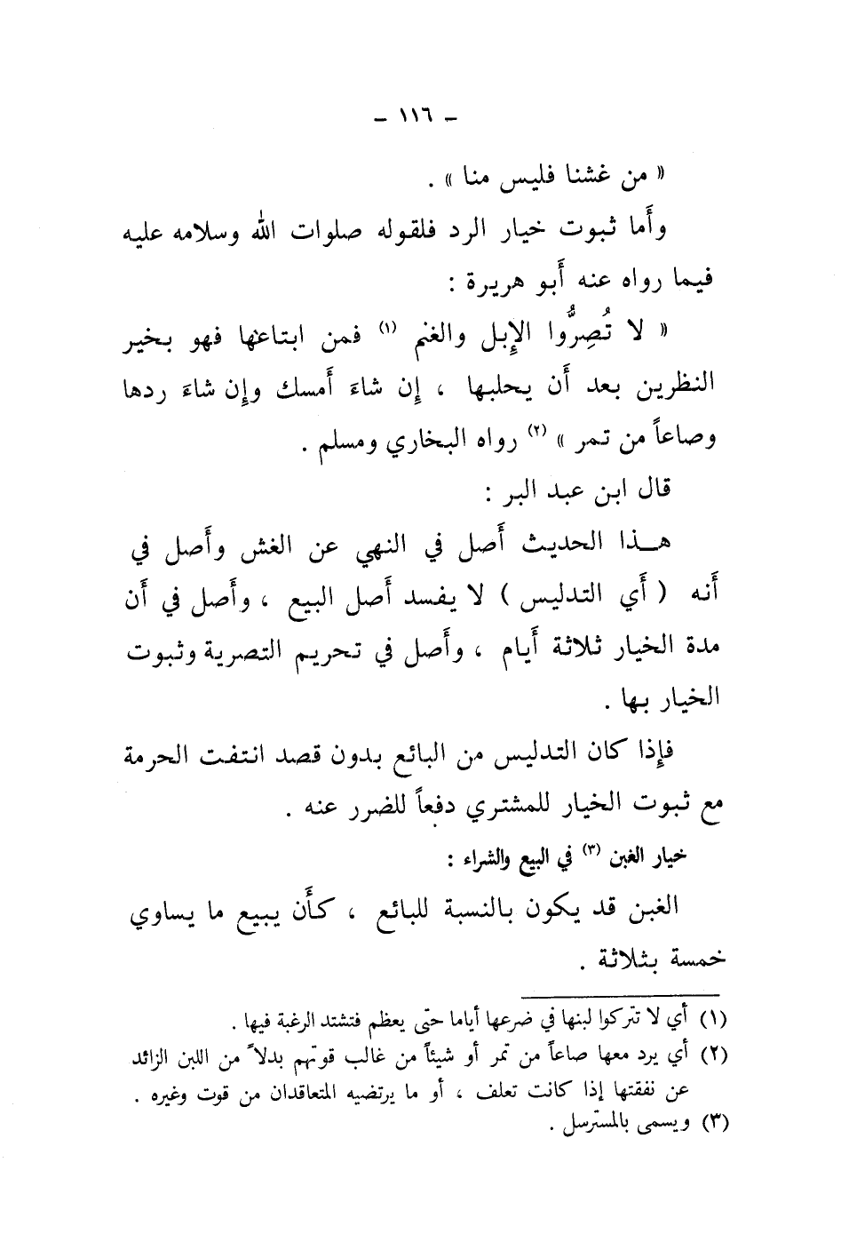 " لا تصروا الابل والغنم (1) فمن ابتاعها فهو بخير النظرين بعد أن يحلبها، إن شاء أمسك وإن شاء ردها وصاعا من تمر " (2) رواه البخاري ومسلم.