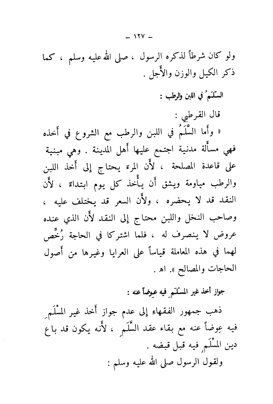 السلم في اللبن والرطب: قال القرطبي: " وأما السلم في اللبن والرطب مع الشروع في أخذه فهي مسألة مدنية اجتمع عليها أهل المدينة. وهي مبنية على قاعدة المصلحة، لان المرء يحتاج إلى أخذ اللبن والرطب مياومة ويشق أن يأخذ كل يوم ابتداء، لان النقد قد لا يحضره، ولان السعر قد يختلف عليه، وصاحب النخل واللبن محتاج إلى النقد لان الذي عنده عروض لا ينصرف له، فلما اشتركا في الحاجة رخص لهما في هذه المعاملة قياسا على العرايا وغيرها من أصول الحاجات والمصالح ". اه.