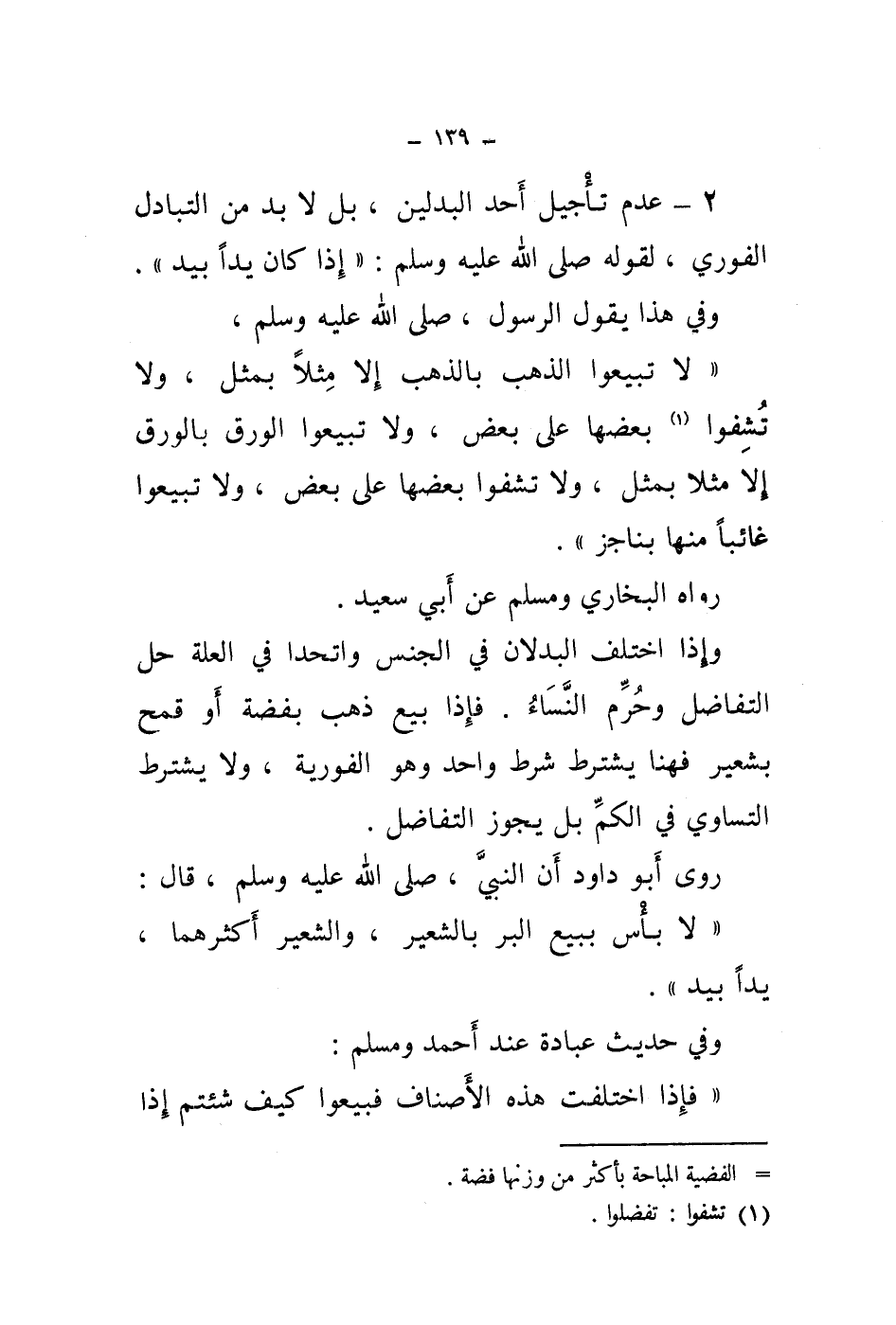 وفي هذا يقول الرسول، صلى الله عليه وسلم، " لا تبيعوا الذهب بالذهب إلا مثلا بمثل، ولا تشفوا (1) بعضها على بعض، ولا تبيعوا الورق بالورق إلا مثلا بمثل، ولا تشفوا بعضها على بعض، ولا تبيعوا غائبا منها بناجز ".