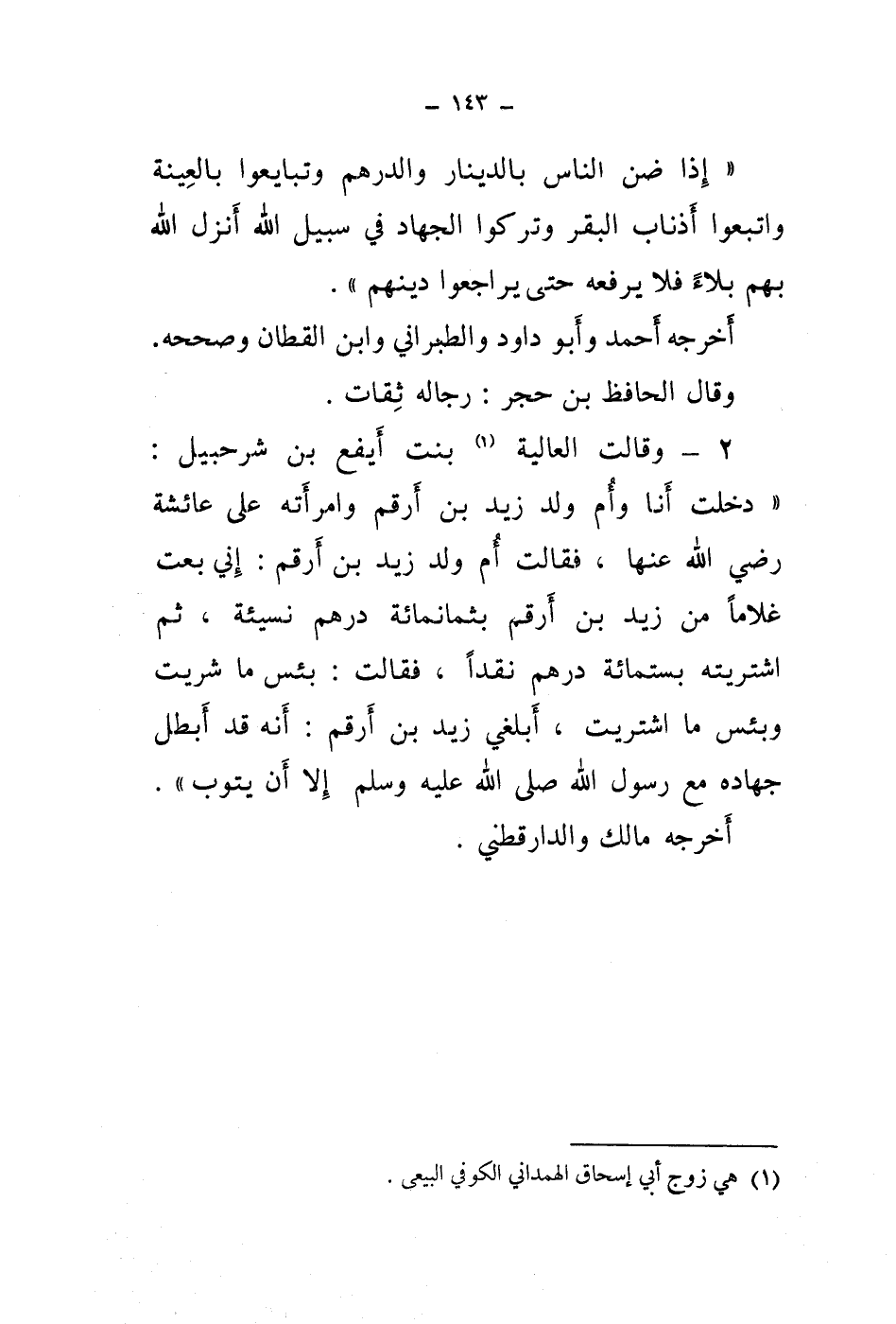 2 - وقالت العالية (1) بنت أيفع بن شرحبيل: " دخلت أنا وأم ولد زيد بن أرقم وامرأته على عائشة رضي الله عنها، فقالت أم ولد زيد بن أرقم: إني بعت غلاما من زيد بن أرقم بثمانمائة درهم نسيئة، ثم اشتريته بستمائة درهم نقدا، فقالت: بئس ما شريت وبئس ما اشتريت، أبلغي زيد بن أرقم: أنه قد أبطل جهاده مع رسول الله صلى الله عليه وسلم إلا أن يتوب ".
