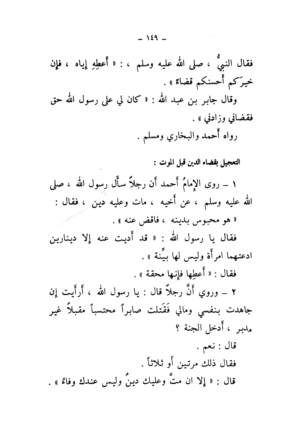 2 - وروي أن رجلا قال: يا رسول الله، أرأيت إن جاهدت بنفسي ومالي فقتلت صابرا محتسبا مقبلا غير مدبر، أدخل الجنة؟ قال: نعم. فقال ذلك مرتين أو ثلاثا. قال: " إلا ان مت وعليك دين وليس عندك وفاء ".