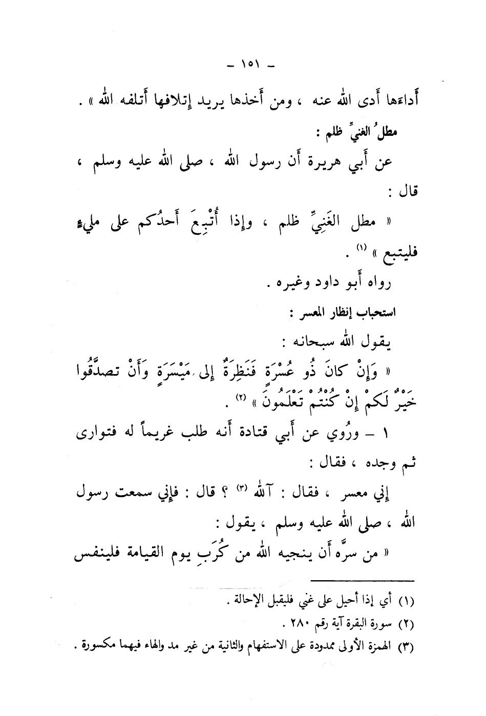 استحباب إنظار المعسر: يقول الله سبحانه: " وإن كان ذو عسرة فنظرة إلى ميسرة وأن تصدقوا خير لكم إن كنتم تعلمون " (2) .