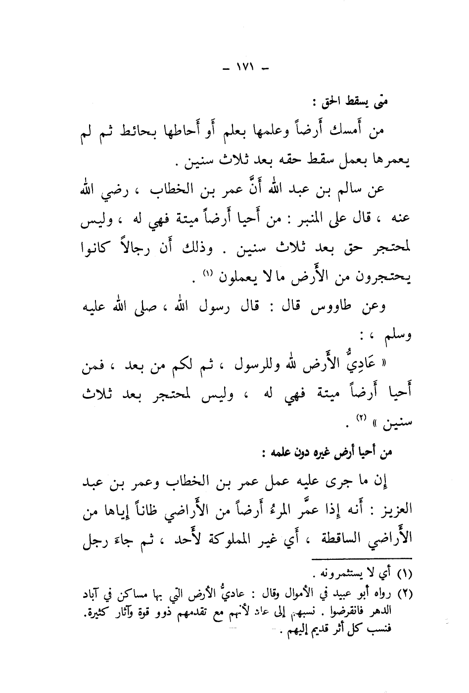إن ما جرى عليه عمل عمر بن الخطاب وعمر بن عبد العزيز: أنه إذا عمر المرء أرضا من الاراضي ظانا إياها من الاراضي الساقطة، أي غير المملوكة لاحد، ثم جاء رجل