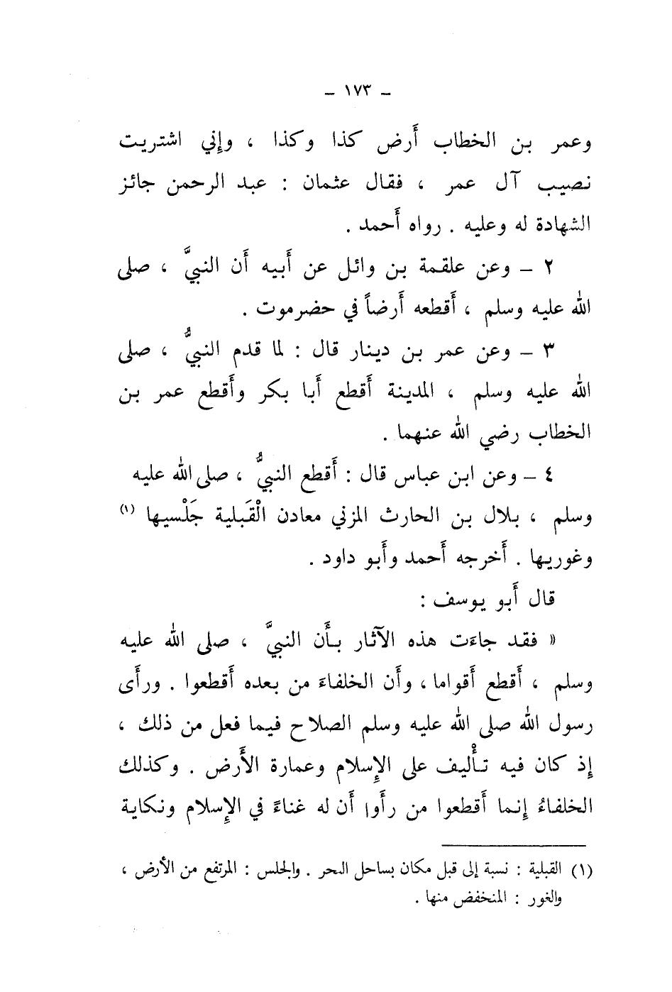 " فقد جاءت هذه الاثار بأن النبي، صلى الله عليه وسلم، أقطع أقواما، وأن الخلفاء من بعده أقطعوا.