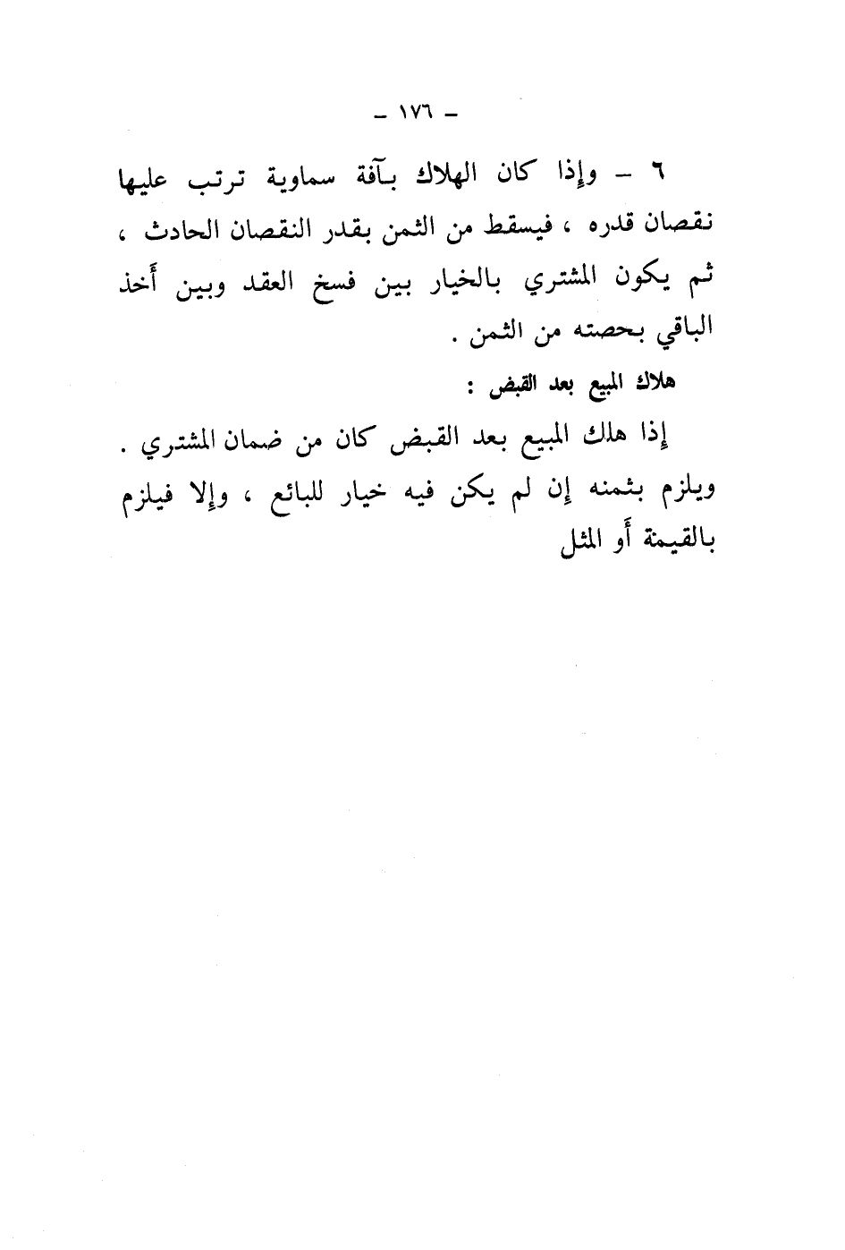 6 - وإذا كان الهلاك بآفة سماوية ترتب عليها نقصان قدره، فيسقط من الثمن بقدر النقصان الحادث، ثم يكون المشتري بالخيار بين فسخ العقد وبين أخذ الباقي بحصته من الثمن.