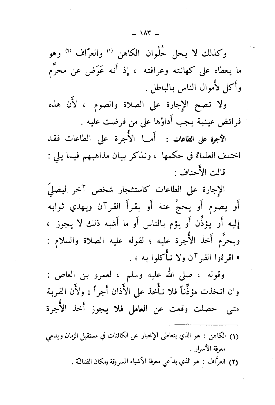وكذلك لا يحل حلوان الكاهن (1) والعراف (2) وهو ما يعطاه على كهانته وعرافته، إذ أنه عوض عن محرم وأكل لاموال الناس بالباطل. ولا تصح الاجارة على الصلاة والصوم، لان هذه فرائض عينية يجب أداؤها على من فرضت عليه.