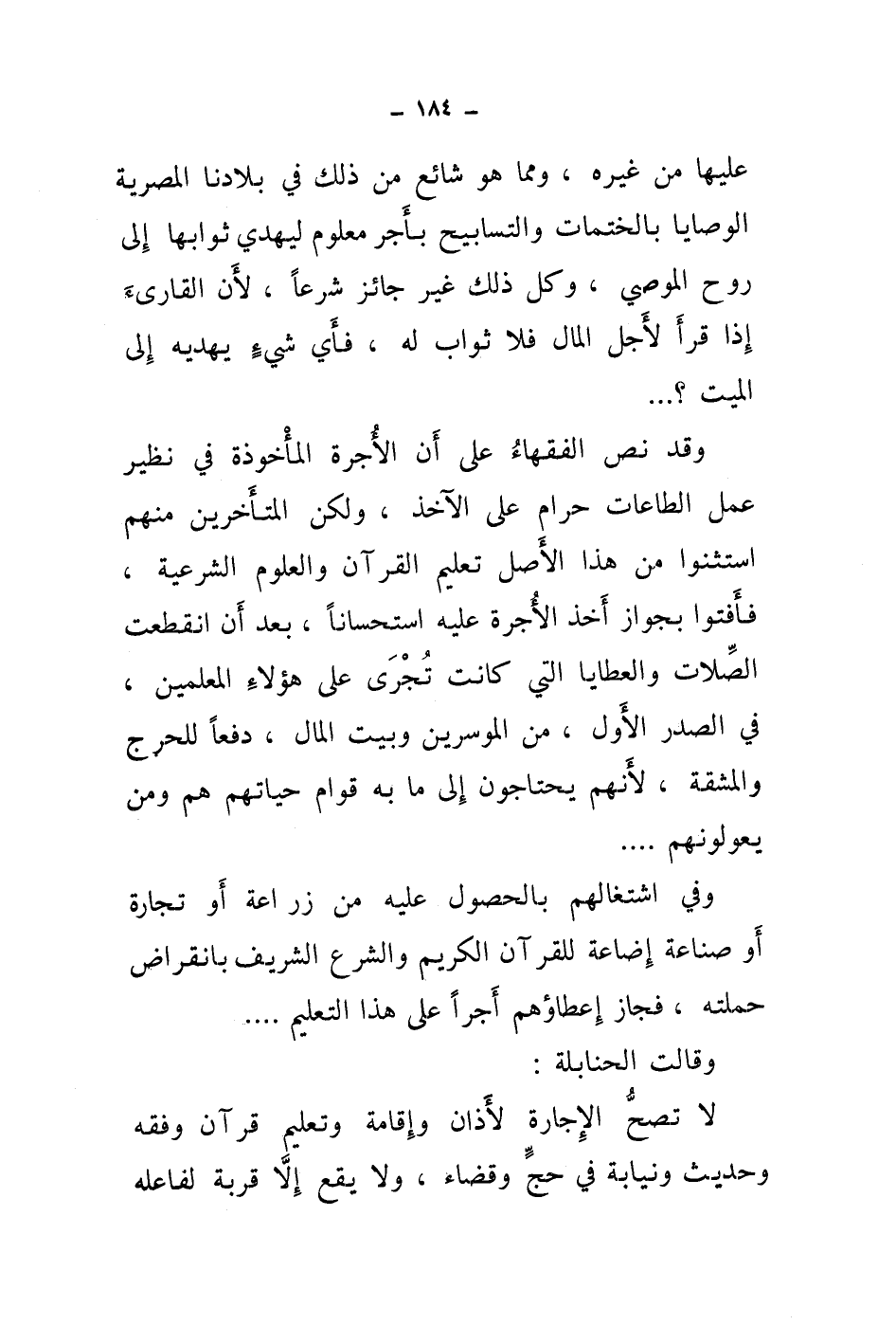 عليها من غيره، ومما هو شائع من ذلك في بلادنا المصرية الوصايا بالختمات والتسابيح بأجر معلوم ليهدي ثوابها إلى روح الموصي، وكل ذلك غير جائز شرعا، لان القارئ إذا قرأ لاجل المال فلا ثواب له، فأي شئ يهديه إلى الميت؟ ... وقد نص الفقهاء على أن الاجرة المأخوذة في نظير عمل الطاعات حرام على الآخذ، ولكن المتأخرين منهم استثنوا من هذا الاصل تعليم القرآن والعلوم الشرعية، فأفتوا بجواز أخذ الاجرة عليه استحسانا، بعد أن انقطعت الصلات والعطايا التي كانت تجرى على هؤلاء المعلمين، في الصدر الاول، من الموسرين وبيت المال، دفعا للحرج والمشقة، لانهم يحتاجون إلى ما به قوام حياتهم هم ومن يعولونهم ... وفي اشتغالهم بالحصول عليه من زراعة أو تجارة أو صناعة إضاعة للقرآن الكريم والشرع الشريف بانقراض حملته، فجاز إعطاؤهم أجرا على هذا التعليم ... وقالت الحنابلة: لا تصح الاجارة لاذان وإقامة وتعليم قرآن وفقه وحديث ونيابة في حج وقضاء، ولا يقع إلا قربة لفاعله