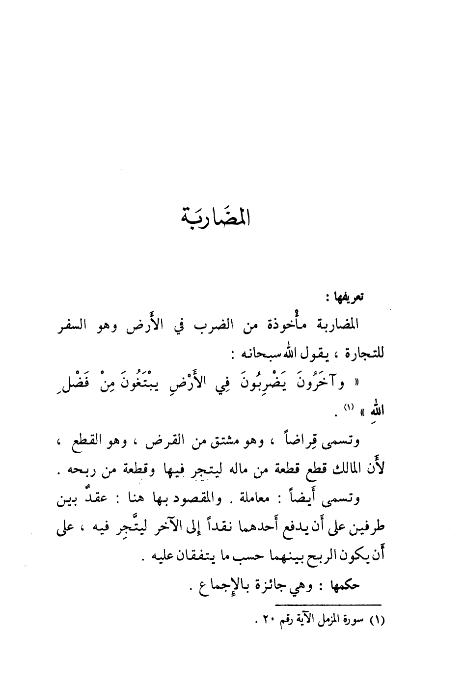 تعريفها: المضاربة مأخوذة من الضرب في الارض وهو السفر للتجارة، يقول الله سبحانه: " وآخرون يضربون في الارض يبتغون من فضل الله " (1) .