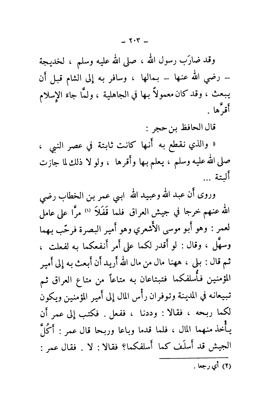 قال الحافظ بن حجر: " والذي نقطع به أنها كانت ثابتة في عصر النبي، صلى الله عليه وسلم، يعلم بها وأقرها، ولولا ذلك لما جازت ألبتة ... وروى أن عبد الله وعبيد الله ابي عمر بن الخطاب رضي الله عنهم خرجا في جيش العراق فلما قفلا (1) مرا على عامل لعمر: وهو أبو موسى الاشعري وهو أمير البصرة فرحب بهما وسهل، وقال: لو أقدر لكما على أمر أنفعكما به لفعلت، ثم قال: بلى، ههنا مال من مال الله أريد أن أبعث به إلى أمير المؤمنين فأسلفكما فتبتاعان به متاعا من متاع العراق ثم تبيعانه في المدينة وتوفران رأس المال إلى أمير المؤمنين ويكون لكما ربحه، فقالا: وددنا، ففعل.