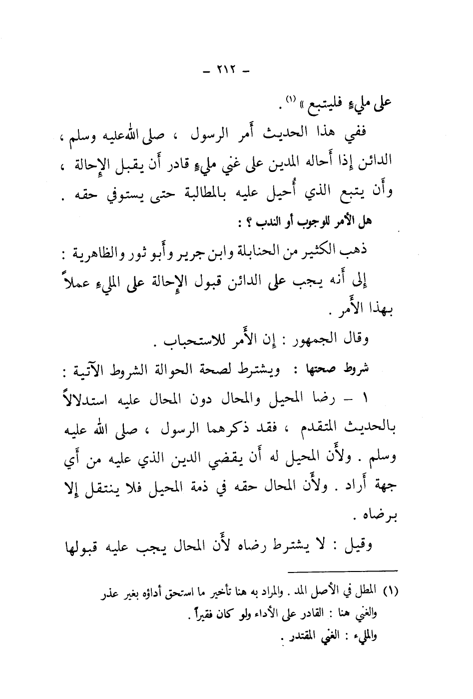 ذهب الكثير من الحنابلة وابن جرير وأبو ثور والظاهرية: إلى أنه يجب على الدائن قبول الاحالة على الملئ عملا بهذا الامر.