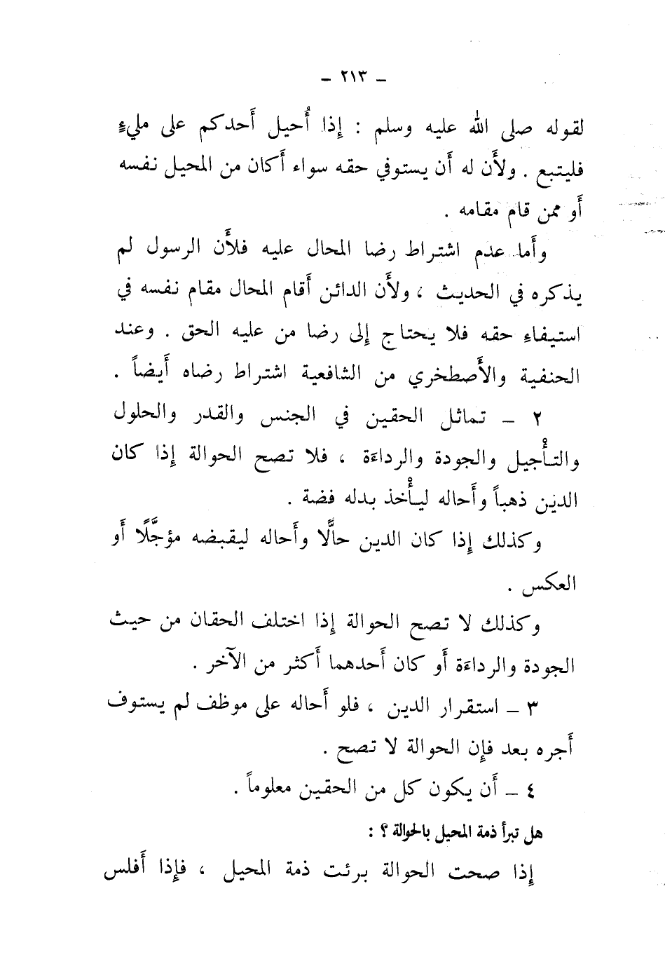 2 - تماثل الحقين في الجنس والقدر والحلول والتأجيل والجودة والرداءة، فلا تصح الحوالة إذا كان الدين ذهبا وأحاله ليأخذ بدله فضة. وكذلك إذا كان الدين حالا وأحاله ليقبضه مؤجلا أو العكس. وكذلك لا تصح الحوالة إذا اختلف الحقان من حيث الجودة والرداءة أو كان أحدهما أكثر من الآخر.